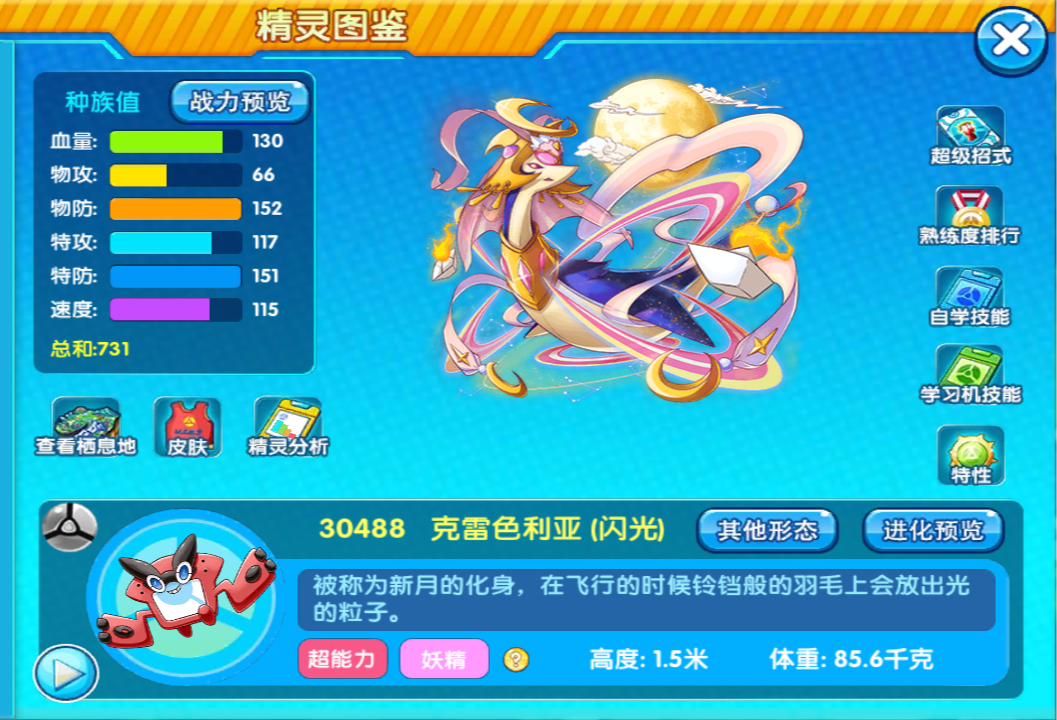 总结分析:闪光克雷色利亚是这次中秋节另外的一个限定精灵,在外形和颜值方面都比较高,实力也是有的,但是他的输出比较低,只适合辅助,但是也有一定的输出能力,所以我才给她搭配了输出的技能,但他的打击面确实比较的盲点,比较怕对面的钢属性精灵,所以说,搭配一个火属性的技能,或者是火属性的队友是至关重要的,有人可能会问了,为什么给她使用自我复原?而不是月光?在这里呢,我要解释清楚,那就是不知道怎么回事,月光这个技能,无论是普通的还是闪光的,都无法学习了,也不知道这是bug还是怎么一回事,反正就是不能够学习了,以前倒是可以学习,但是,闪光的可以学习自我复原,这对于平民玩家来说是有点不太公平的,因为普通的和闪光的之间只相差30点种族值,但是如果因为技能上面的改变,可能会导致玩家们的心里面有些小小的不平衡,所以如果真是bug的话,我希望尽快修复。