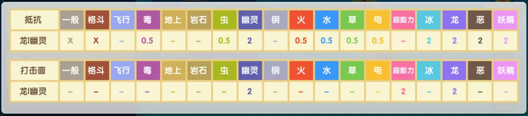 多龙巴鲁托是一只幽灵+龙的双属性精灵。打击面:幽灵+龙能够克制的仅有3个属性(幽灵、超能力、龙),非常的少,但难能可贵的是没有被抵抗的属性。虽然2倍克制的属性仅有3个且超能力、幽灵属性较为冷门,但所幸的是其余皆为一倍克制关系。利用这个特点,在技能搭配或者队伍组成的时候,需要利用好任何机会进行强化,不然多龙巴鲁托的攻击都是一倍伤害,无法一击致命。