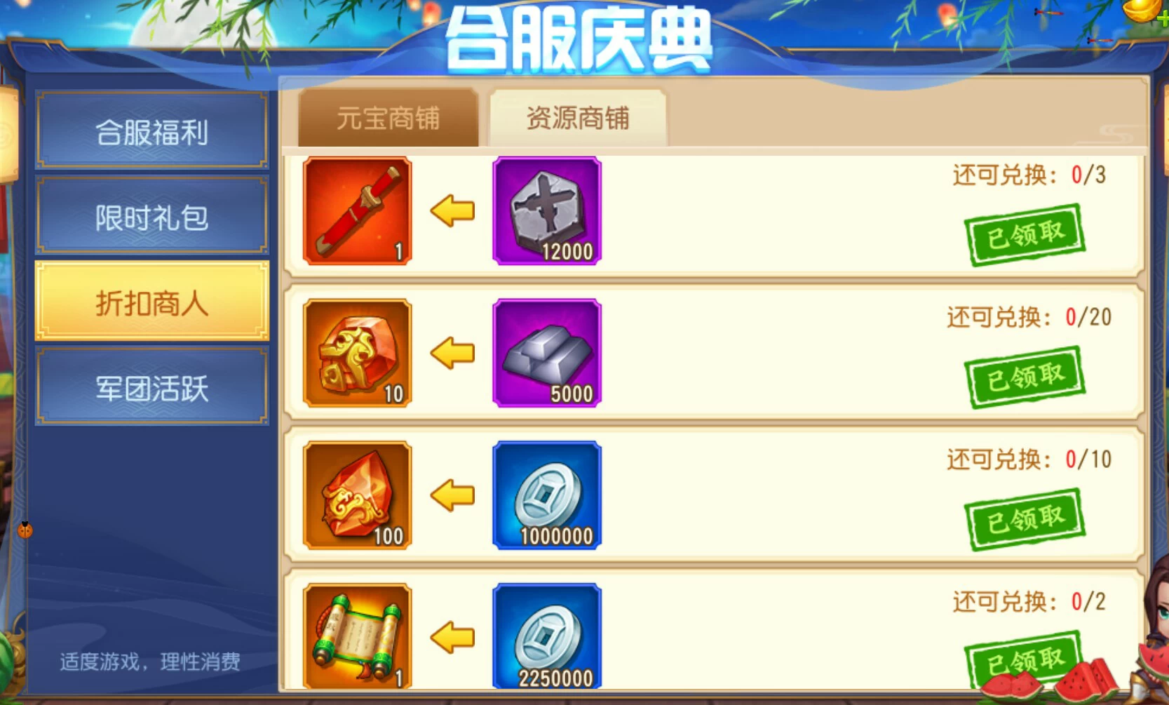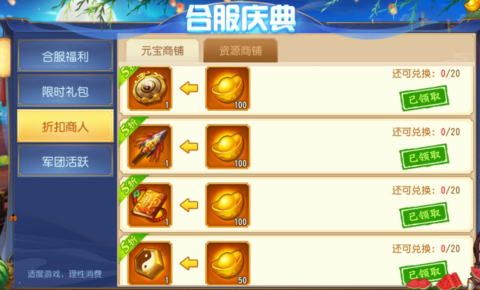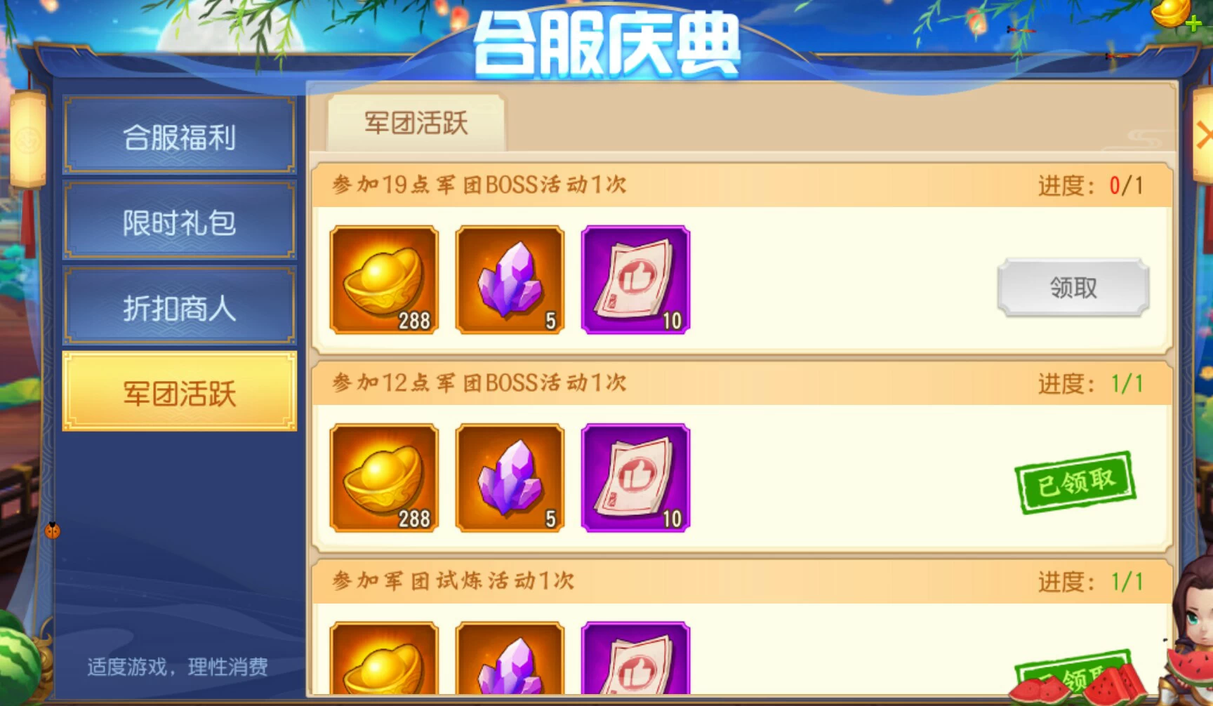 1.登录礼包(合服2天,每天登录可领取 元宝588、体力丹和精力丹各5个)。