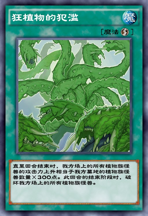 速攻魔法卡可以让这张卡使用起来更灵活,但是副作用是结束阶段会破坏我方场上所有植物族怪兽,所以慎用。