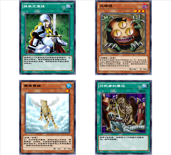 卡盒中的泛用卡是让你即使不玩卡盒里的卡组,也想来抽卡的存在。这里我主要推荐【抹杀之使徒】【三眼怪】【黄泉青蛙】【对死者的奠仪】这四张卡。