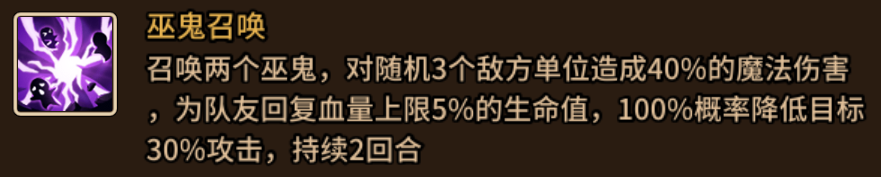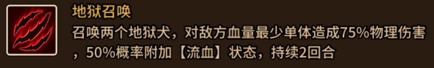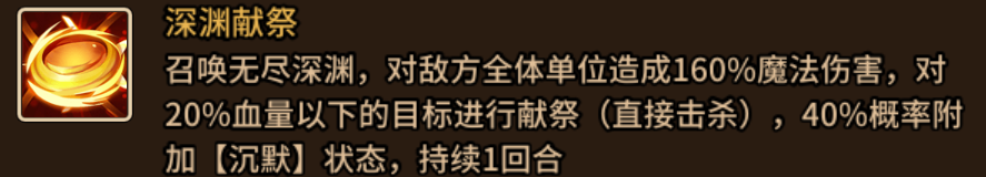 技能循环:第一回合一技能(召唤地狱犬),第二回合不行动(地狱犬行动),(打死地狱犬)第三回合三技能(烈焰恐惧),第四回合二技能(巫鬼召唤),第五回合三技能(烈焰恐惧),第六回合二技能(召唤巫鬼),第七回合四技能(深渊献祭),第八回合二技能(召唤巫鬼),后面为二、四技能循环,没有空档。