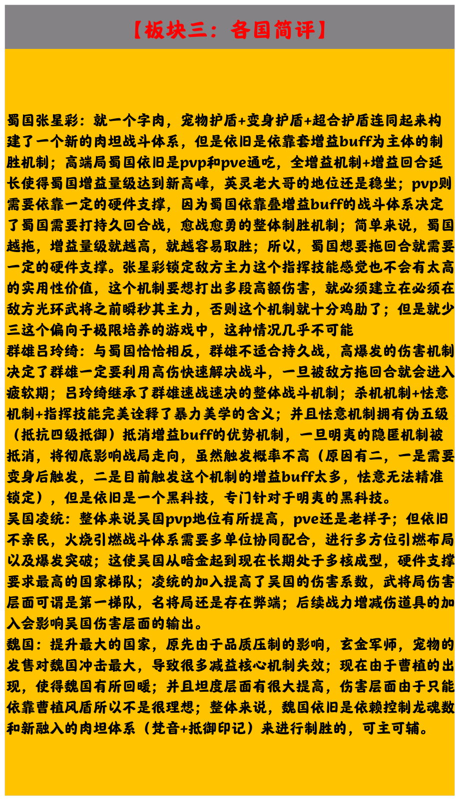 <各国趋势>:蜀吴门槛增高,对于硬件要求和玄一武将的星级要求相对于魏群要高;群雄就是单纯的无限制爆发,生存方面有所欠缺;魏国总体坦度提高,门槛降低,总体来说,群魏成为新的亲民国家