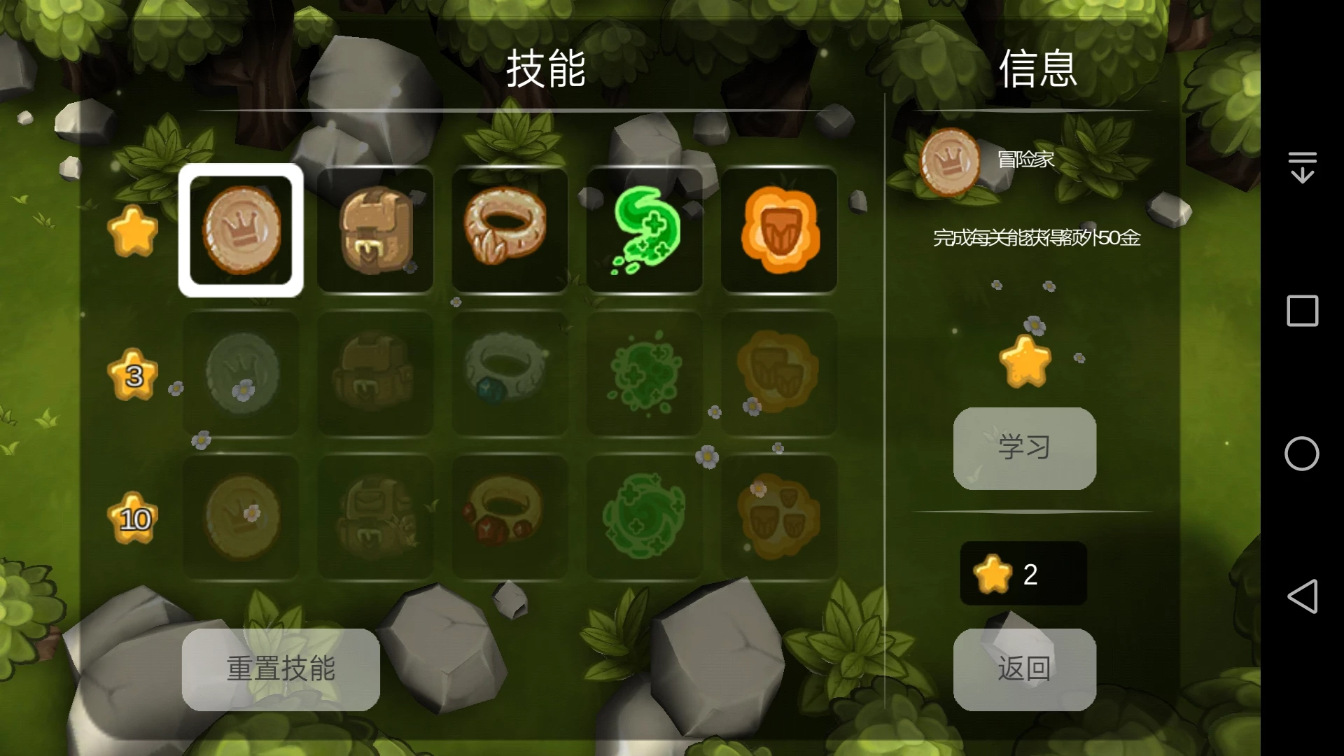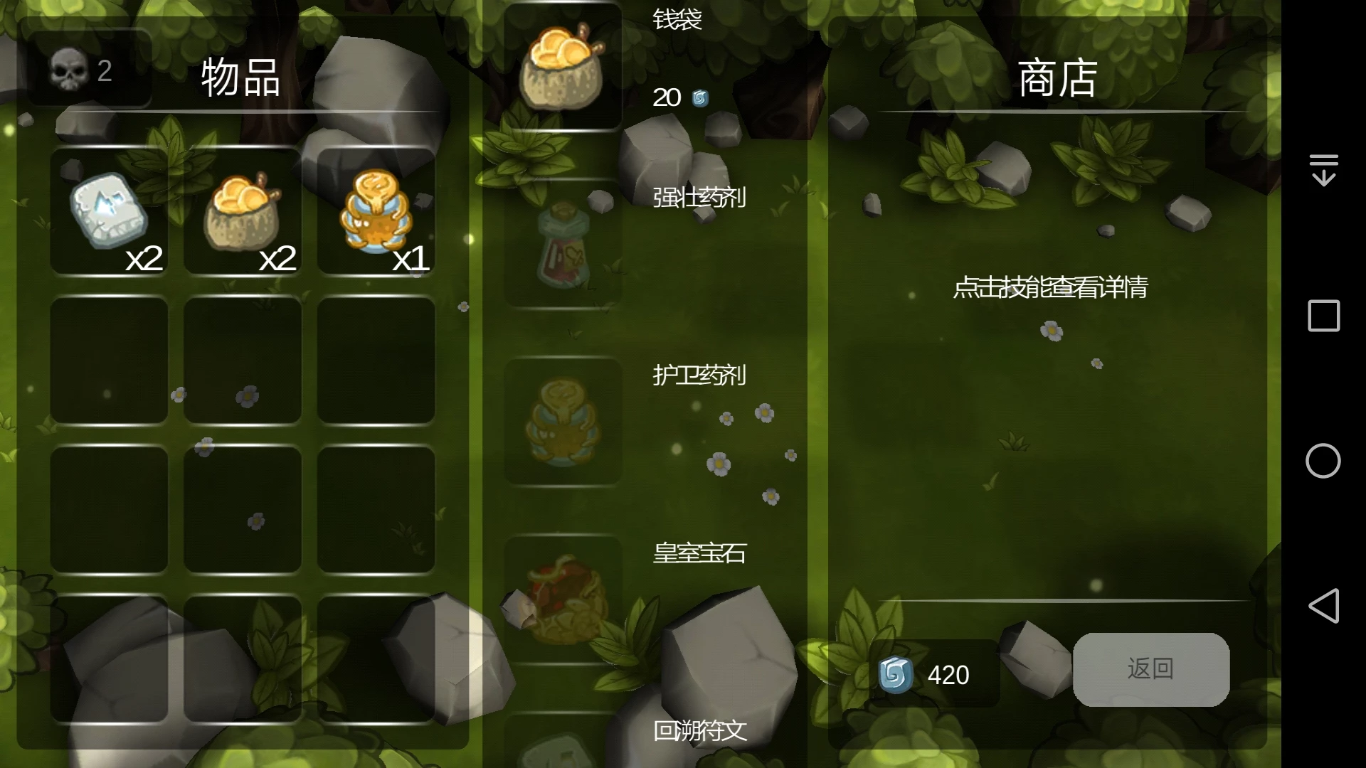 最初的界面就是你所拥有的英雄,或者你可以从中购买英雄,当然也是你升级英雄的界面。任务界面,你可以从中查看自己的任务,在探索中完成任务从而获得魔法石,魔法石可以用来购买与升级英雄,还可以在商店中消费。探索技能是你在冒险中可以的天赋技能,比如可以获得神秘守护或者是更多的金币。背包就是你探险所获得的东西。