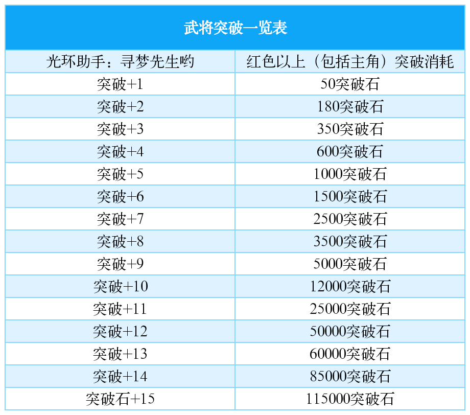 ③玩法攻略:前期一定要预存资源,由下图表格可以看出,突破玩法一开始所需的突破石并不很多,但是随着突破层数越高,所需的资源便成指数爆炸般增涨,所以不要掉以轻心,突破石前期永远也不嫌多,能捞一个是一个。