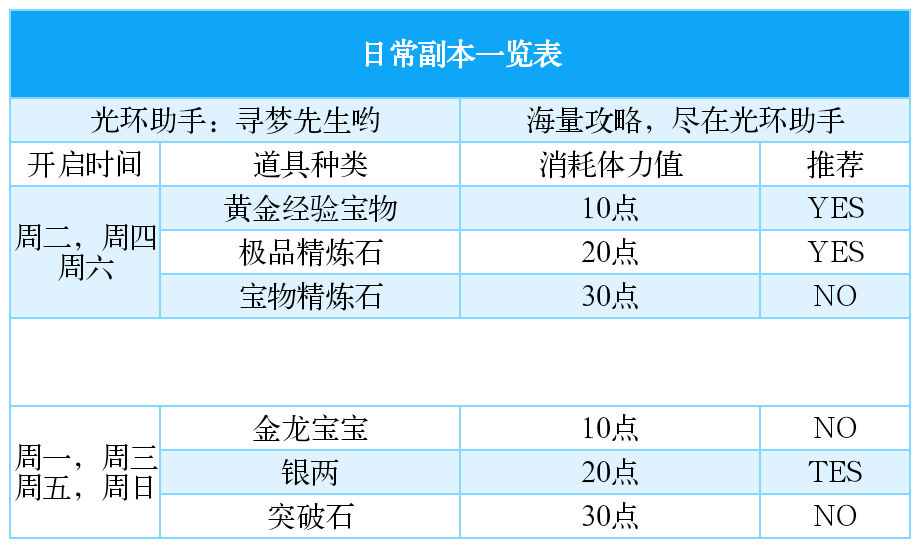 ③玩法攻略:双数日中黄金经验宝物和极品精炼可以攻打,因为前期极限主将肯定会用到的,而宝物精炼石一般只培养主将的话用不了那么多;单数日中银两可以攻打,银两是最容易获得也是需求量最大的道具,单单是时装强化就会用去数亿银币,所以需要一直预存,总而言之,一般150之前甚至之后都可能出现银币不够用的情况;而金龙宝宝可以通过武将商店刷新获得,突破石前期可以通过竞技场获得,没必要浪费体力。