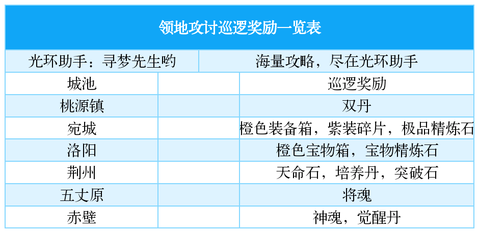 ③玩法攻略:桃源镇必巡逻,且能够高级巡逻的最好高级巡逻(vip8开启高级);普通巡逻三十分钟收益一次,高级巡逻十分钟收益一次(切记不要中级巡逻,用元宝加那几个丹很亏的);然后领地技能只考虑升级桃源镇即可,五级满级后奖励翻倍到100%