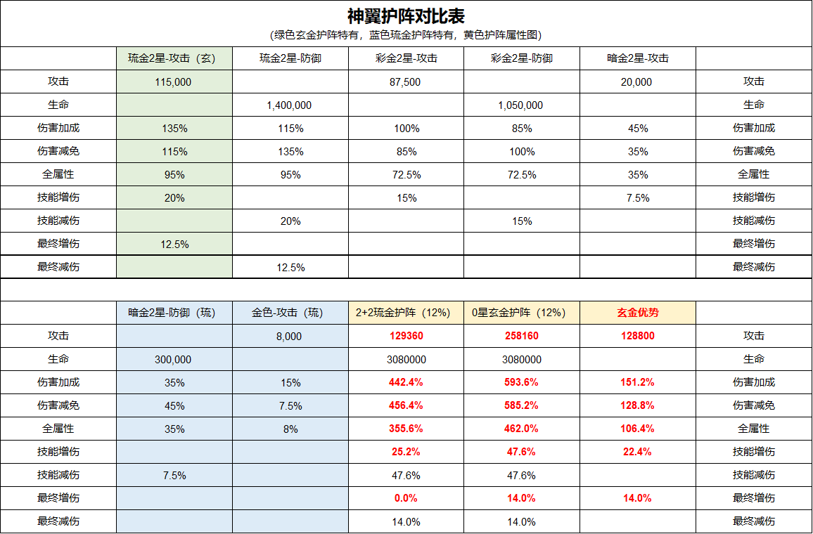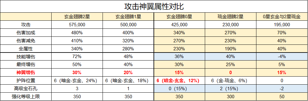 玄金翅膀最大特色为增加神翼增减伤的属性效果,在基础数值方面零星玄金完全可以替换二星琉金,仅在高级宝石镶嵌上略有吃亏,至多少5%最终增减伤(相比神翼增伤玄金翅膀更胜一筹)10级高级宝石拥有5%最终增伤/最终减伤/伤害击穿/伤害格挡