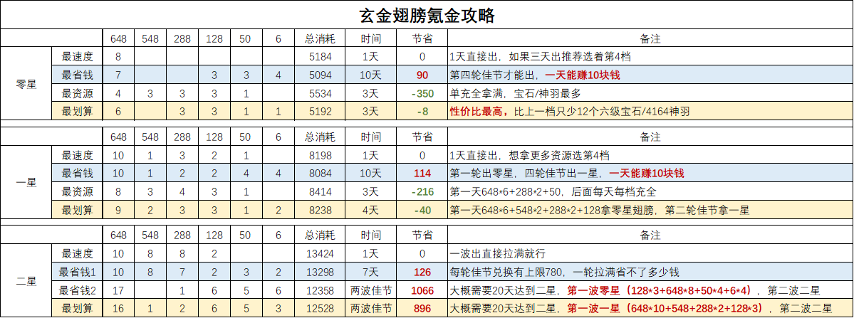 首先限购商店等对于玄金翅膀没有一丁点优惠,只能以最朴素的氪金方法,648=80精华,548=58精华,288=31精华,128=16精华,50=7精华,6=3精华;其次商店最多兑换780精华,以下为最佳氪金攻略,如有更好氪金方法可以评论哦!