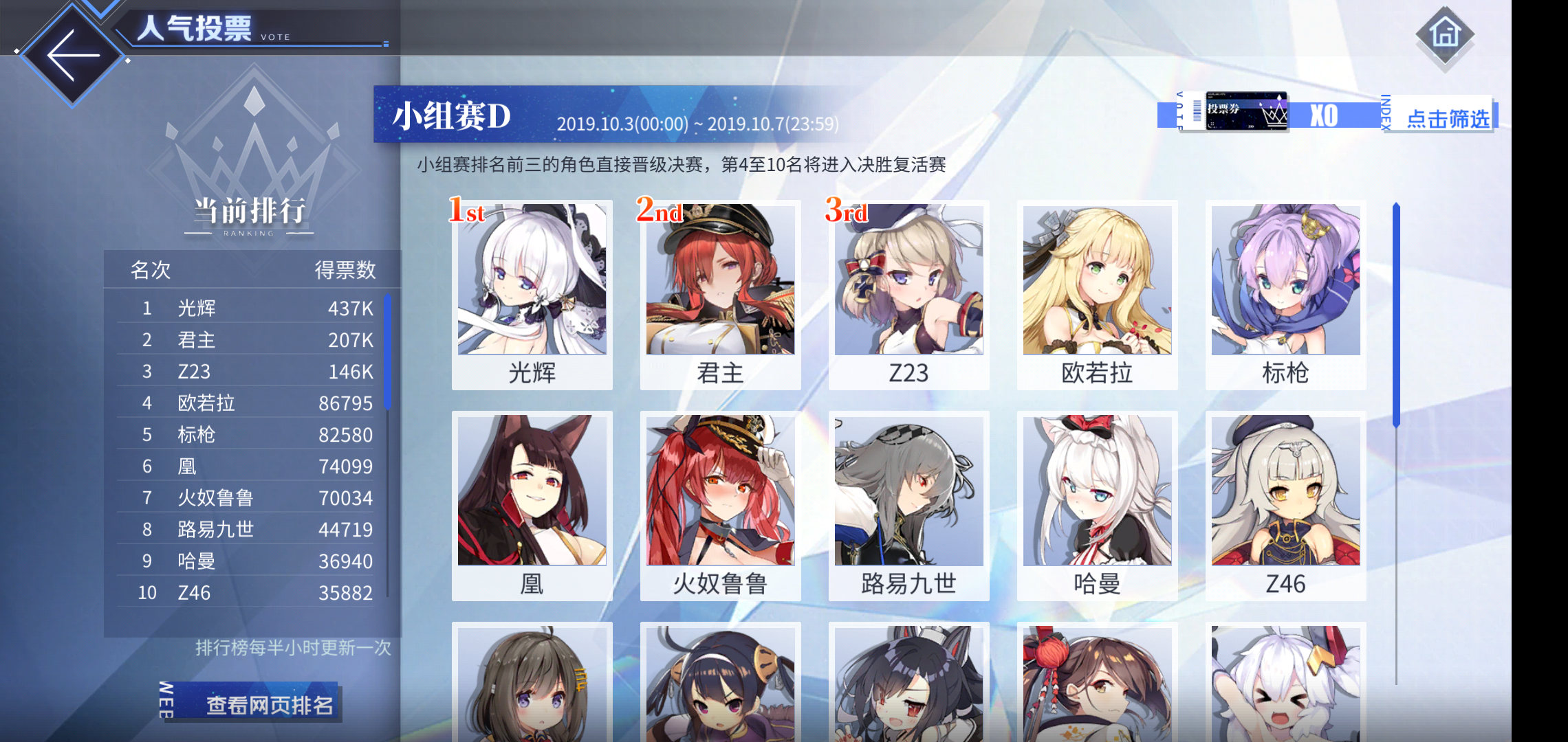 如果这个趋势继续这样发展下去,那么感觉剩下的舰娘就真的只能争取十强了。因为前三除了23可能不太稳定以外基本上不会有太大的变化空间,君主和光辉都是老牌人气船了,而且光辉都出婚纱快两年了还能第一就足以说明她的人气是多么的稳健。