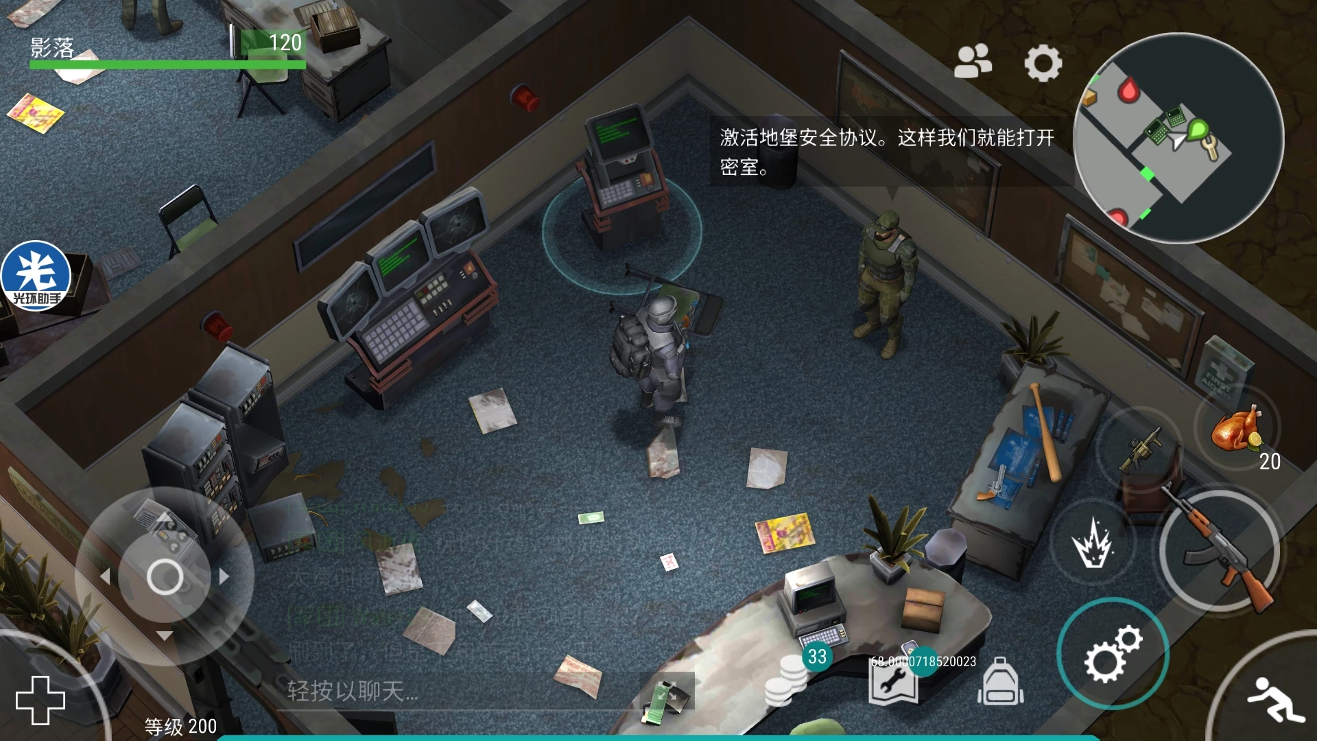 然后他说到了密室,密室在地堡三层,一直往里面探索,在过了一座桥后直走,有一扇打不开的房间能打开了,因为激活了安全协议。如图所示↓