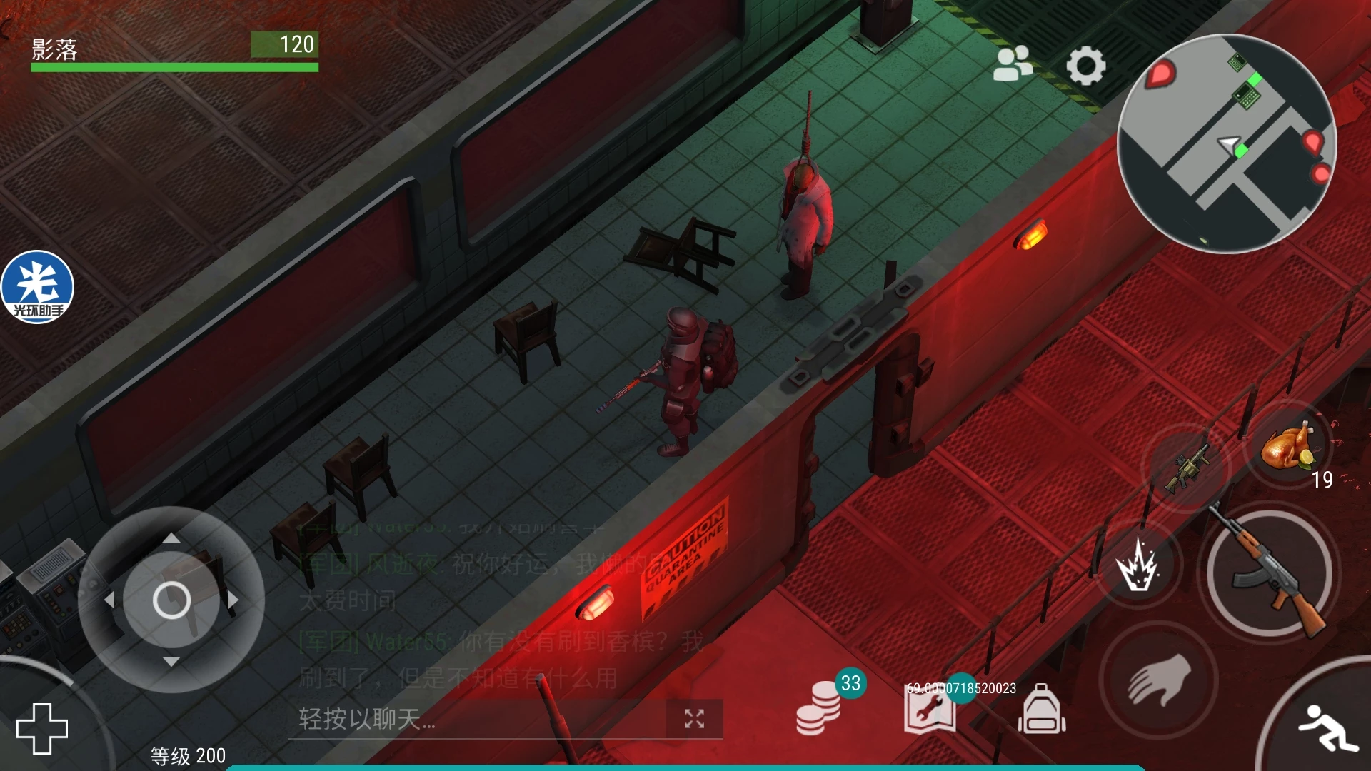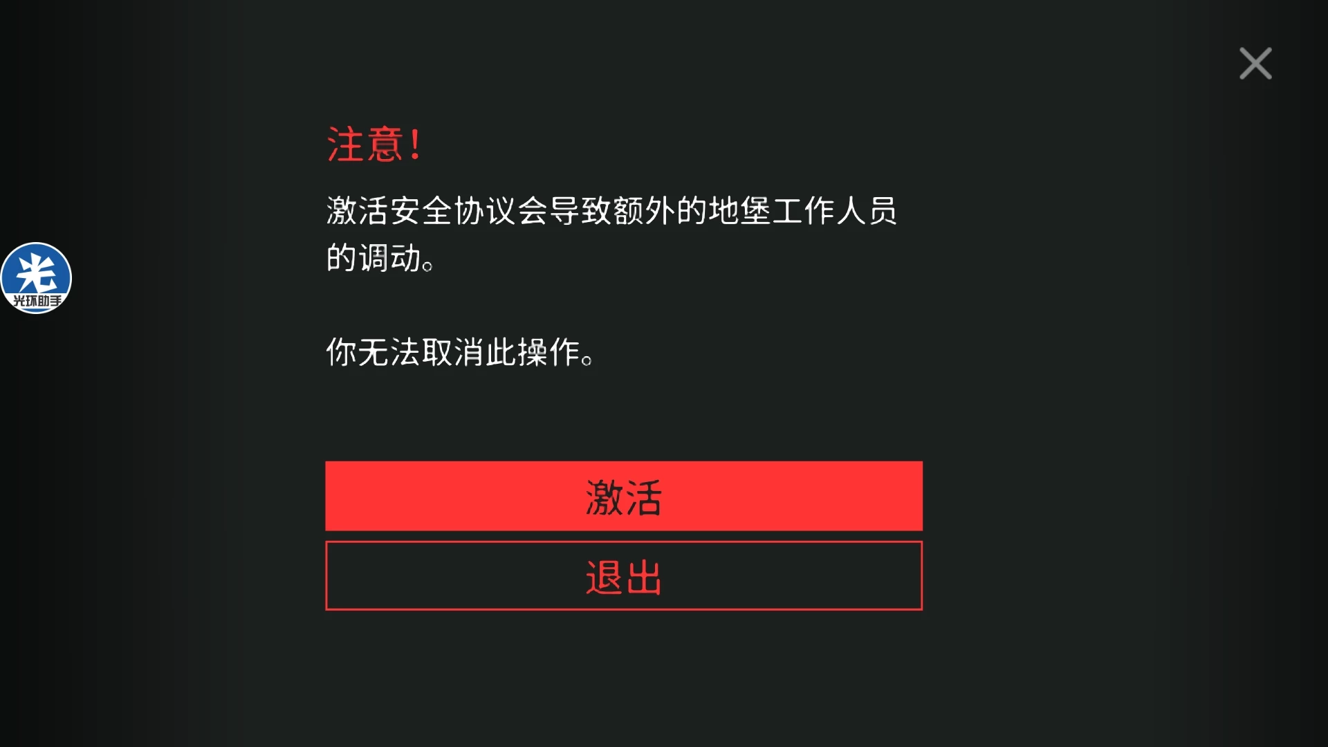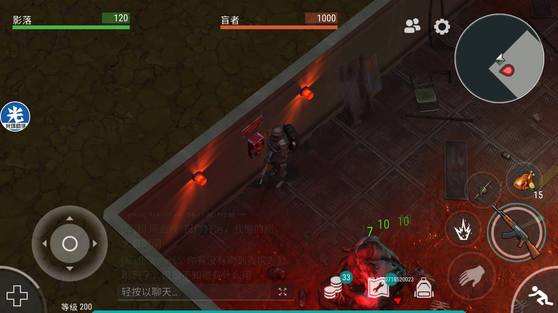 他会跑到地图左上角吃那里的尸体回血,这个时候赶紧跑到地图左上角的两个红灯那里,摁下交互按钮,触发警报,他就会停止回血,具体原理是什么我也不知道,然后继续回合制游戏,你打我五次我打你五枪,直到盲猎400血时。如图所示↓