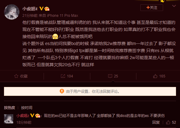 说个题外话 es当初问我要bo的时候 承诺给我2w推荐费 都tm一年过去了 影子都没见 其他所有战队 特别表扬lgd fpx都是第一时间给我推荐费签字费 只有es 从根就烂透了 一个队伍3个人打假赛 不肯打 经理就要找你麻烦 2w可能是某些人的一顿饭而已 但是就算欠我20也不行 就这样”