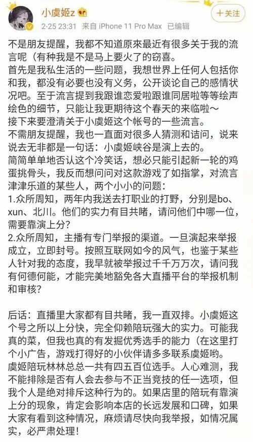 近日小虞姬又在微博发文再次回应,澄清了自己的一些谣言,并表示自己有发觉优秀选手的能力。