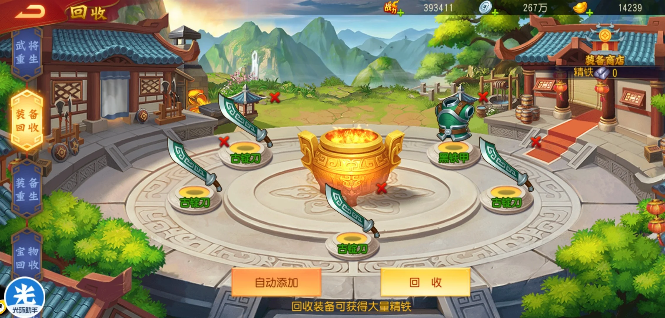 购买了半价奖励,精炼石还是不够,这就需要通过过关斩将获得精铁,在装备商店里购买精炼石。精铁不够用时,可以将不用的绿色蓝色装备回收掉,从而获得精铁。