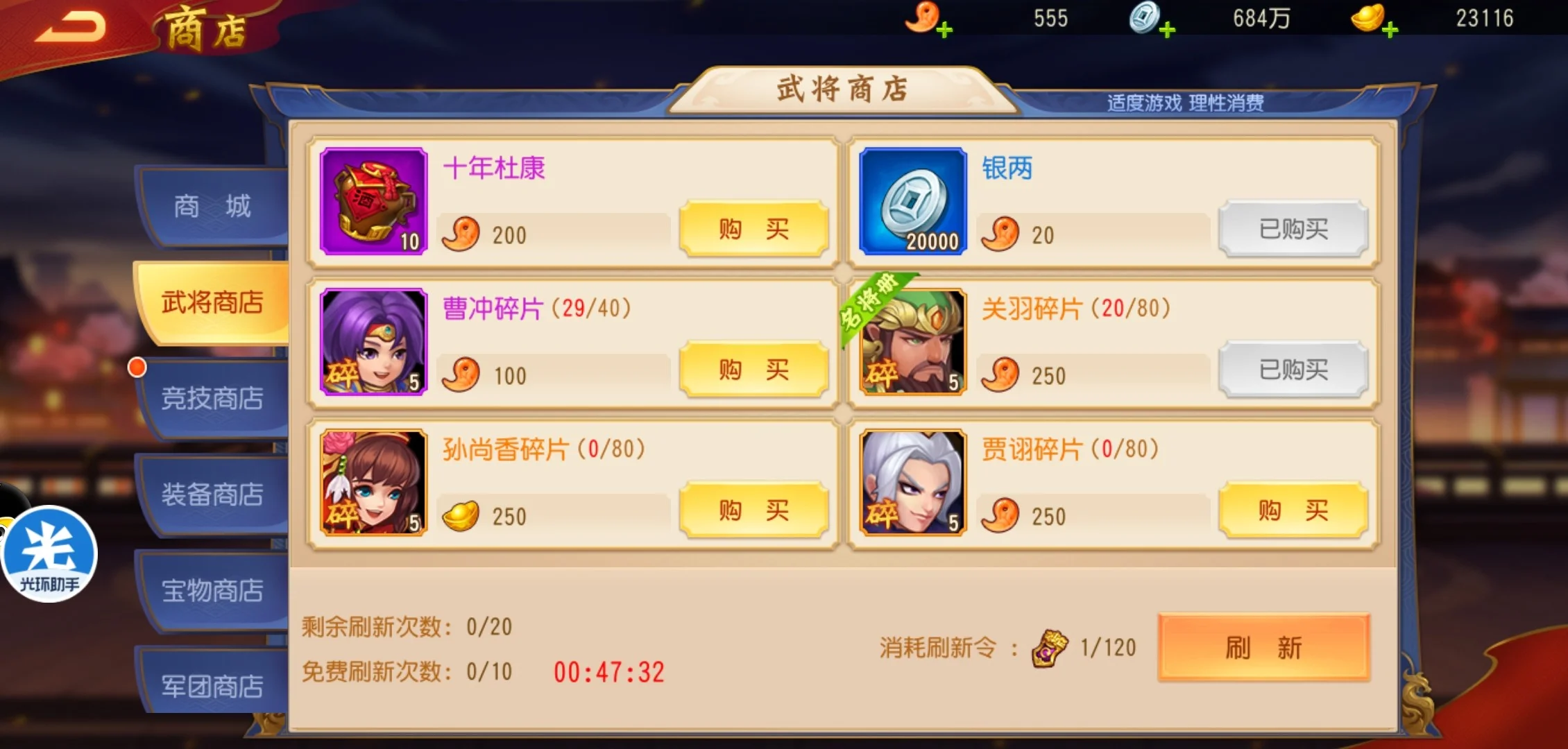 刷新次数不用担心,成就里会奖励补充刷新次数的令牌,可购买次数比较头疼,开服没有那么多的将魂购买武将碎片,而消耗元宝购买又不太划算,怎么才能快速的完成80次购买次数呢?