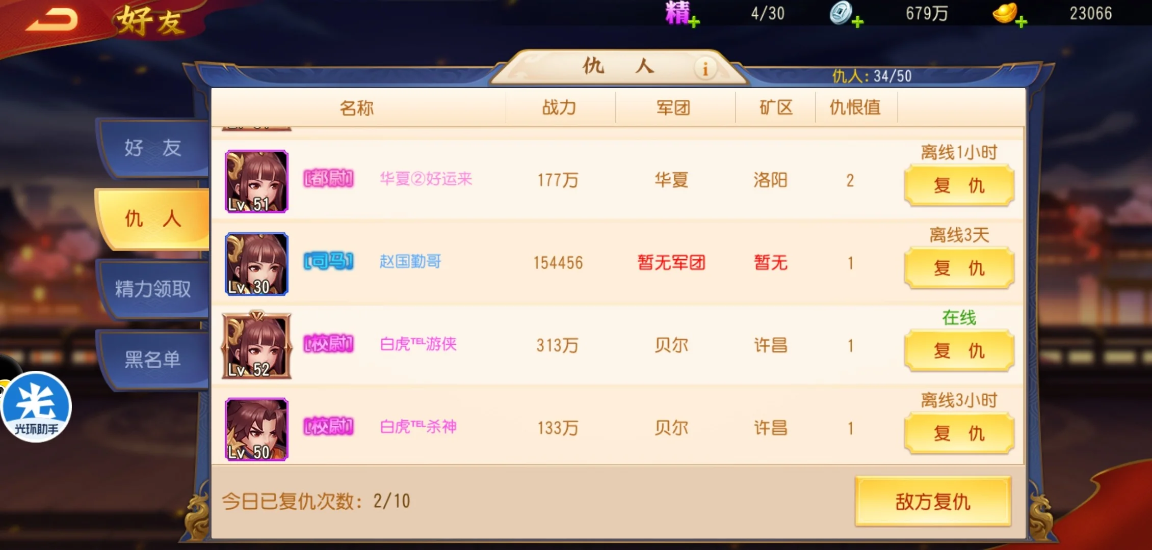 精力丹就更不需要消耗了,除了好友赠送领取精力丹,还可以在仇人里复仇,获得精力。