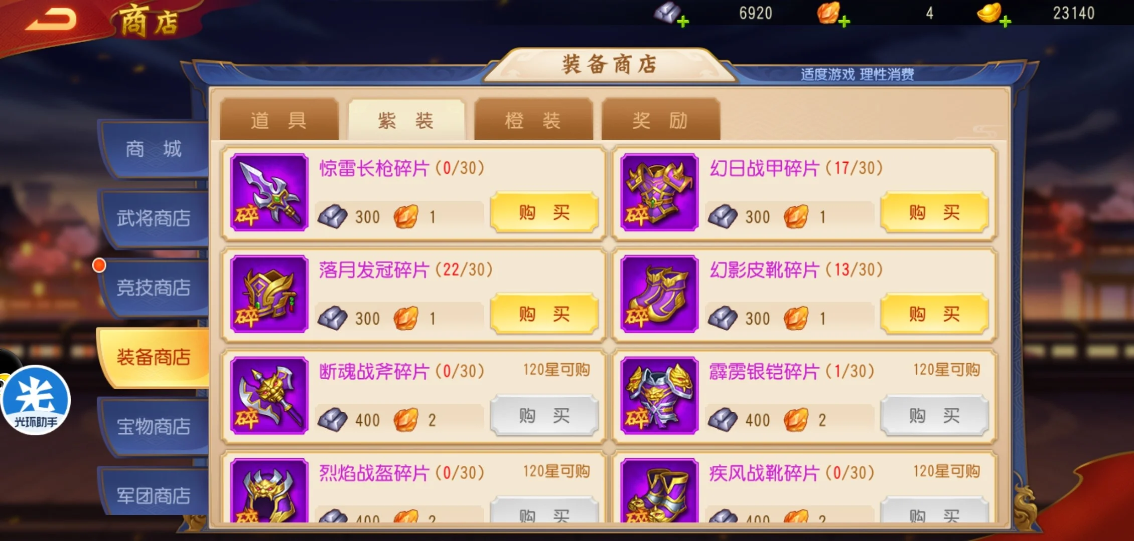 紫色装备平时刷下主线副本就可以收集大量的碎片,开始几天可能会比较缺装备,差两三个碎片就可以合成一件装备的时候,可以买一些,不能把全部的资源集中起来凑一套紫色装备。