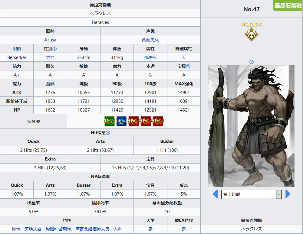 剧情里无敌的存在,却是一直输,游戏里无敌的强度,但却是真正一定意义上的无敌。拿同属性的黑狗(库·丘林〔Alter〕)来比较一下,黑狗是靠次数的回避和战续,赫拉克勒斯是靠羁绊礼装和自身技能达成四次战续,两位在阿特拉斯学院服无敌和减cd的辅助下,近乎无敌(在我倒下前一定将你打倒)赫拉克勒斯在合理的操作下可以达到无缝毅力的效果,而且还有常驻红魔放,加上攻击力提升,其强度并不会输给五星的黑狗,只是要满羁绊礼装才能达到这目标。耗费时间成本大。