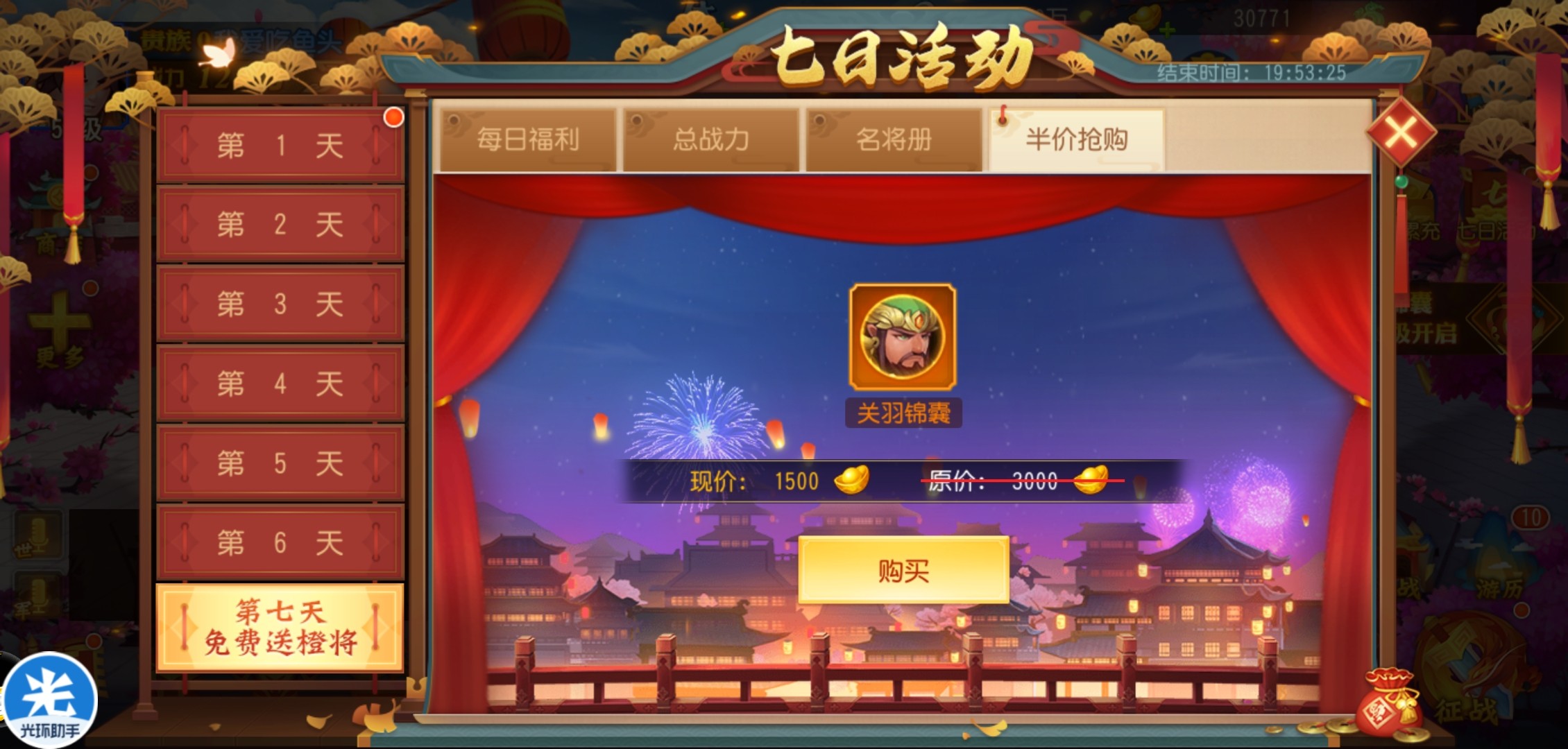 第七日半价奖励是橙色关羽锦囊,可以让佩戴武将增加初始1点怒气。