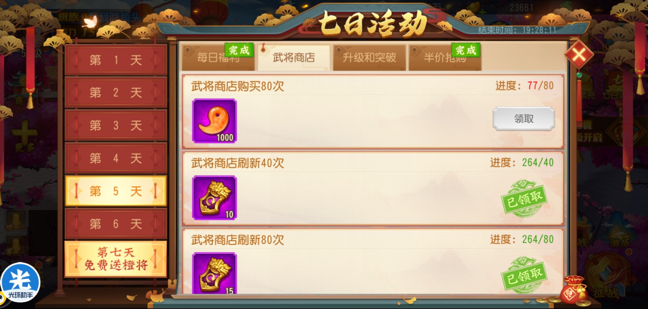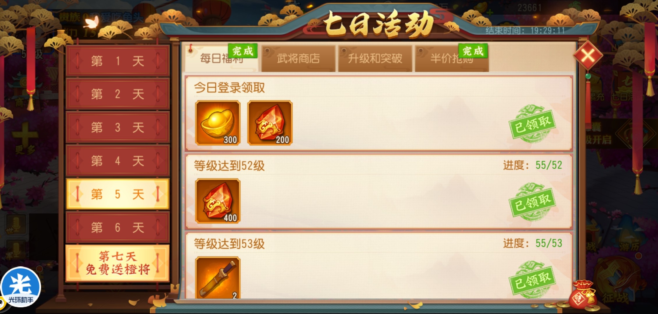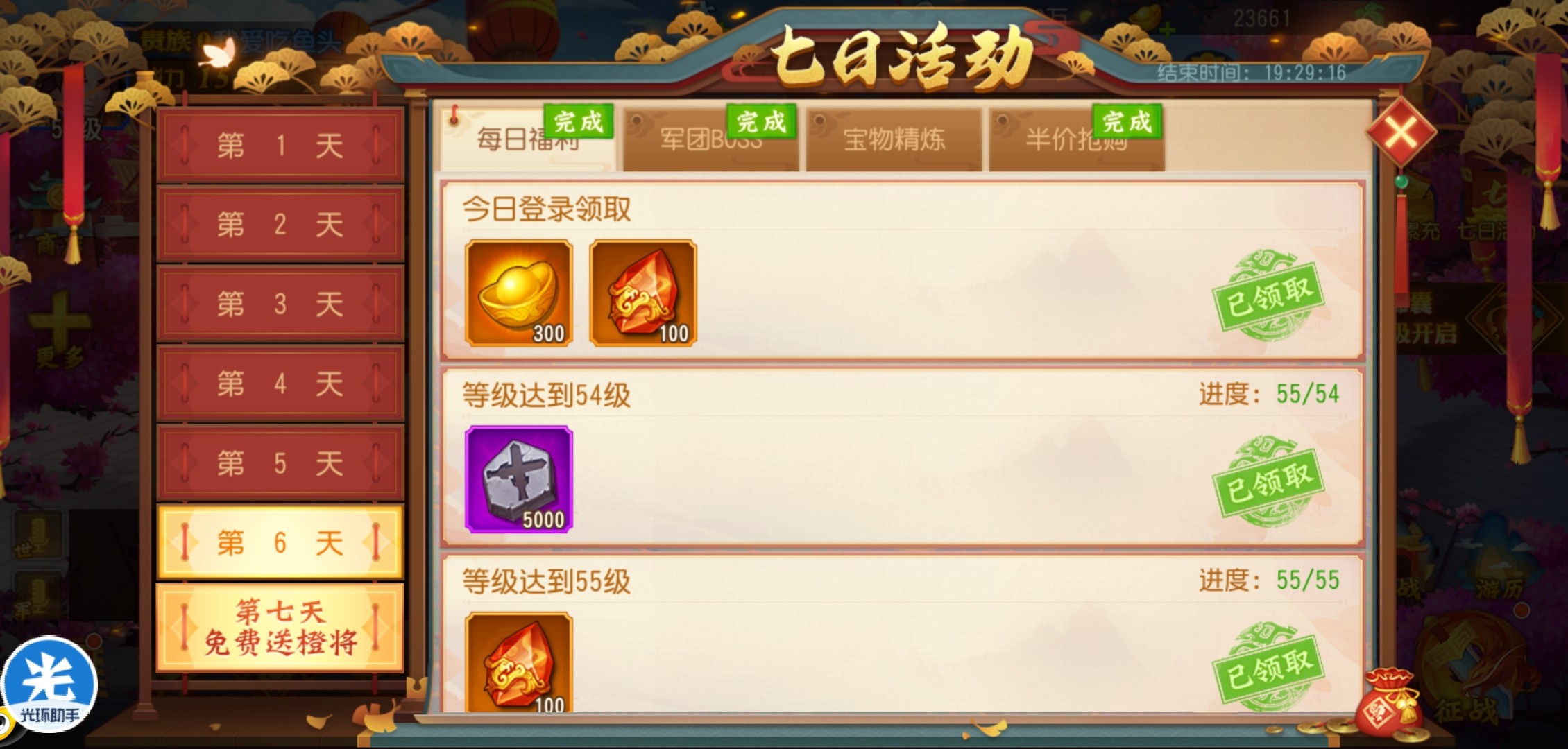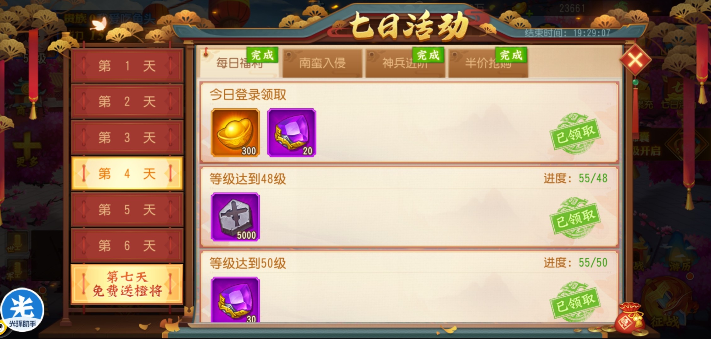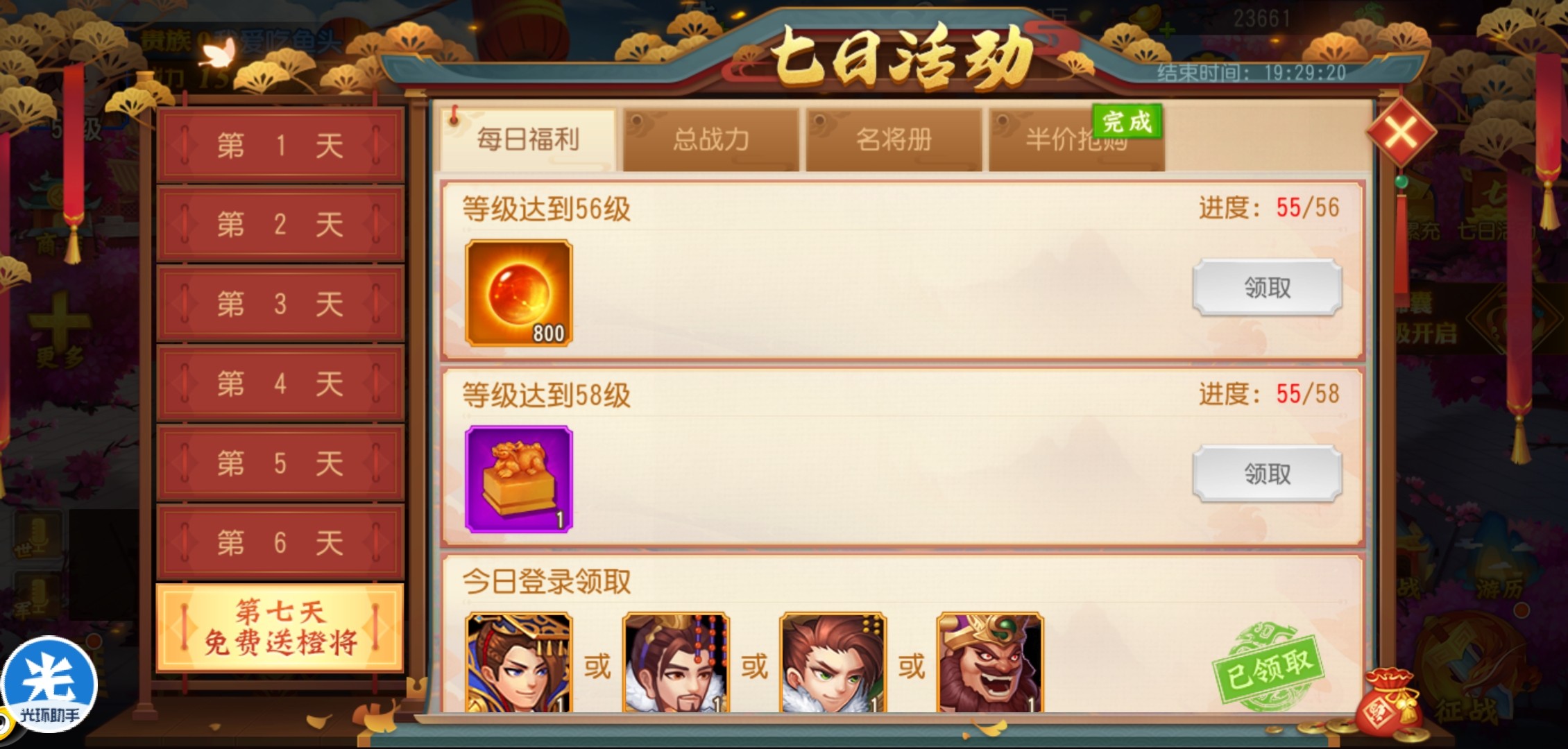 第七天正常完成日常活动,参与军团建设,打造自己阵容,注意收集武将资源,55级后就可以突破6。