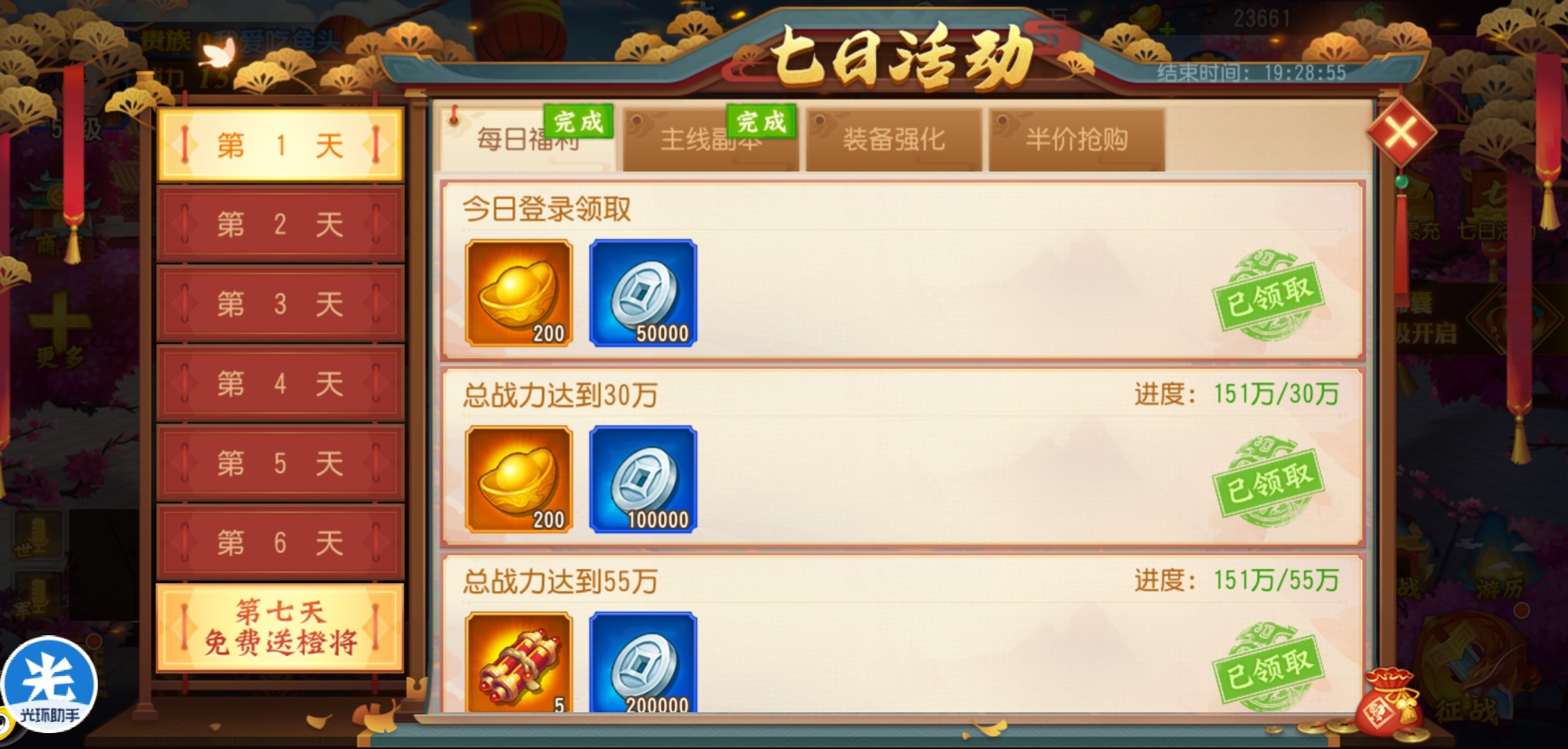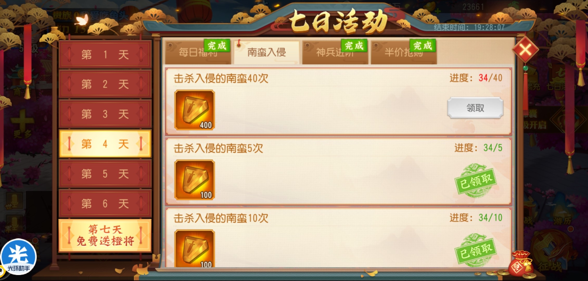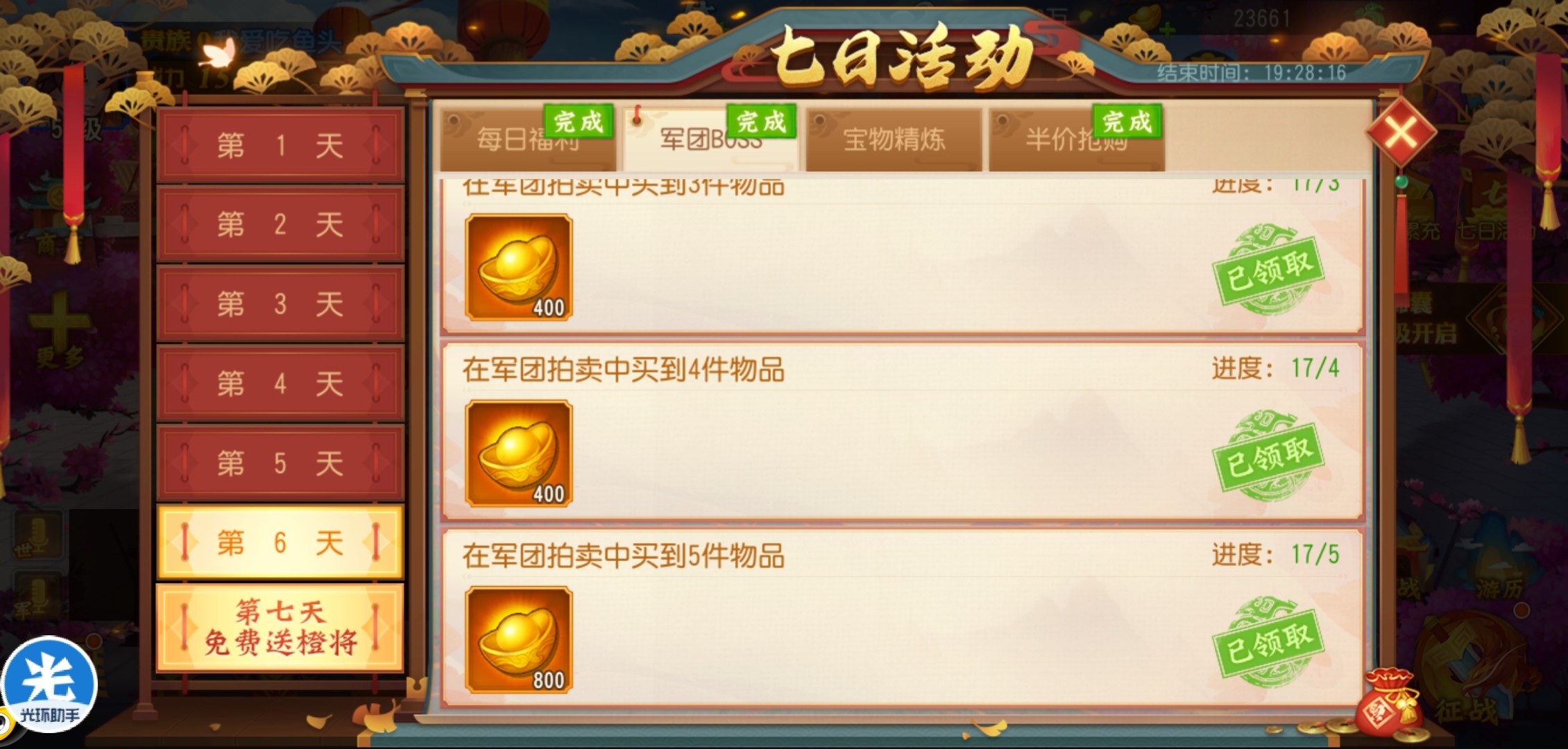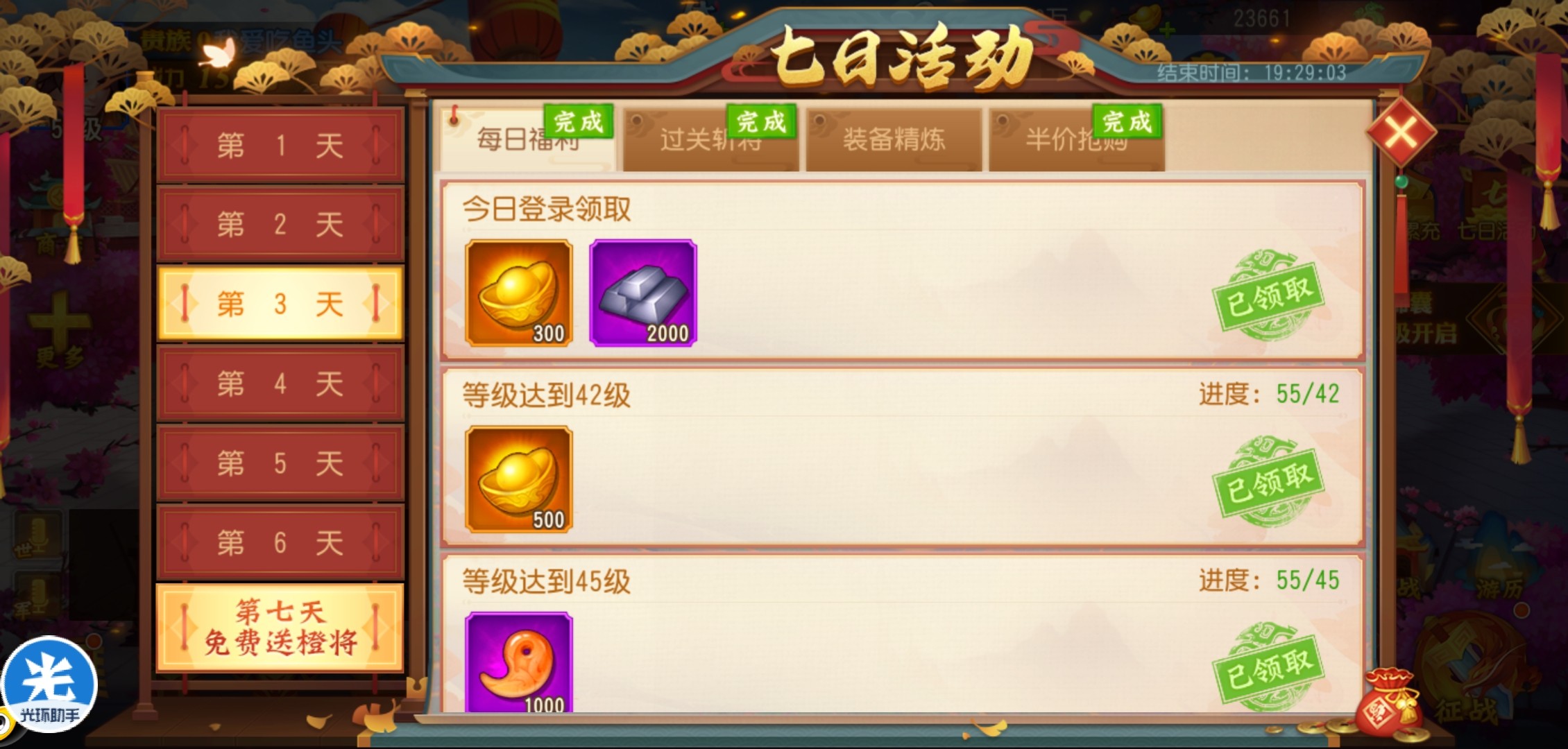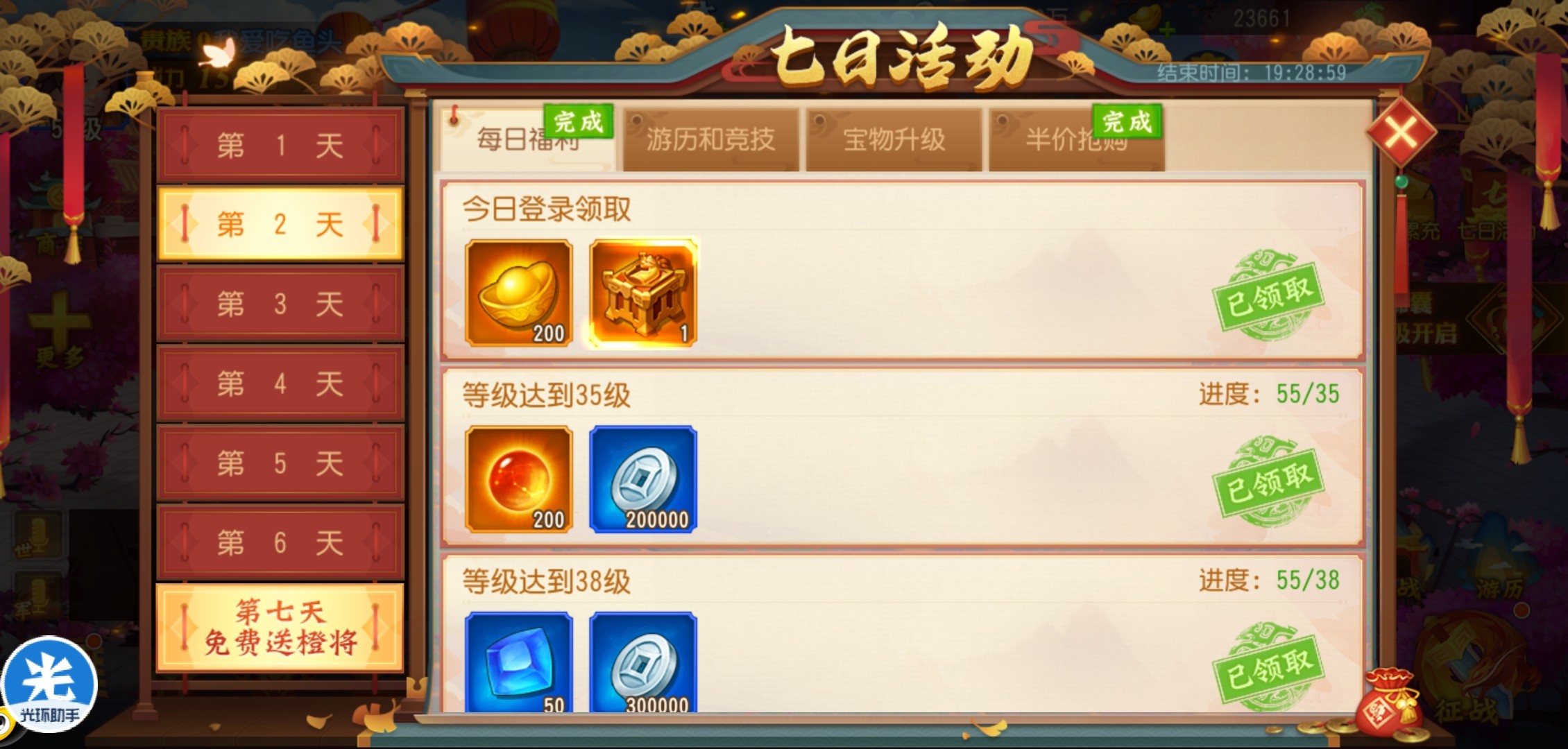 第七天正常完成日常活动,参与军团建设,打造自己阵容,注意收集武将资源,55级后就可以突破6。