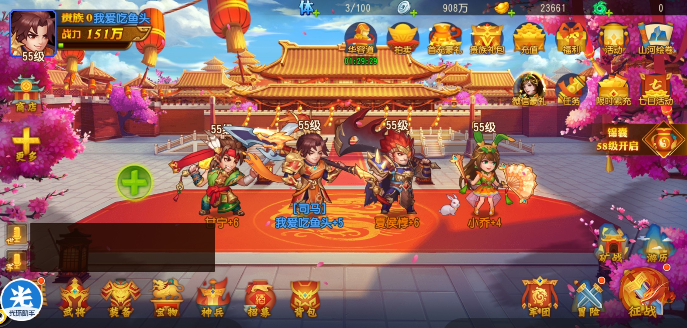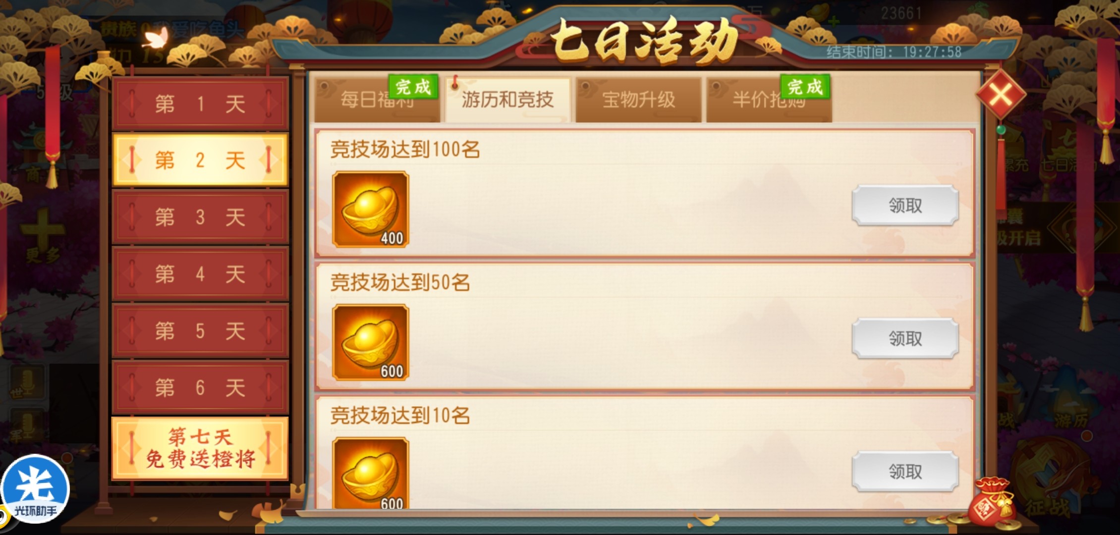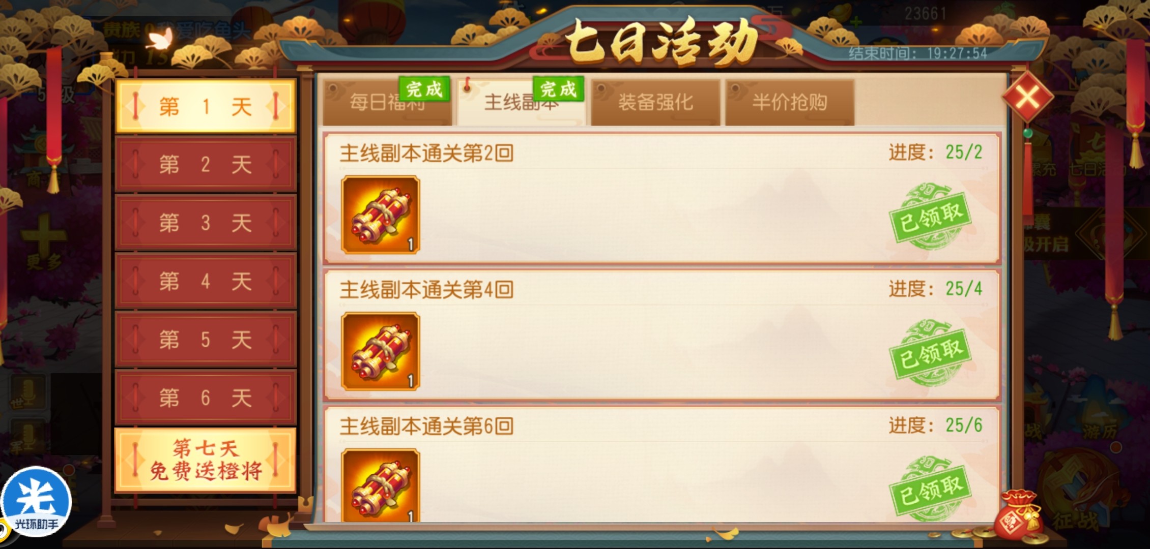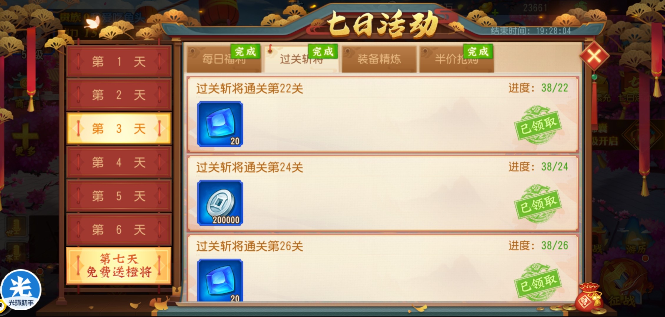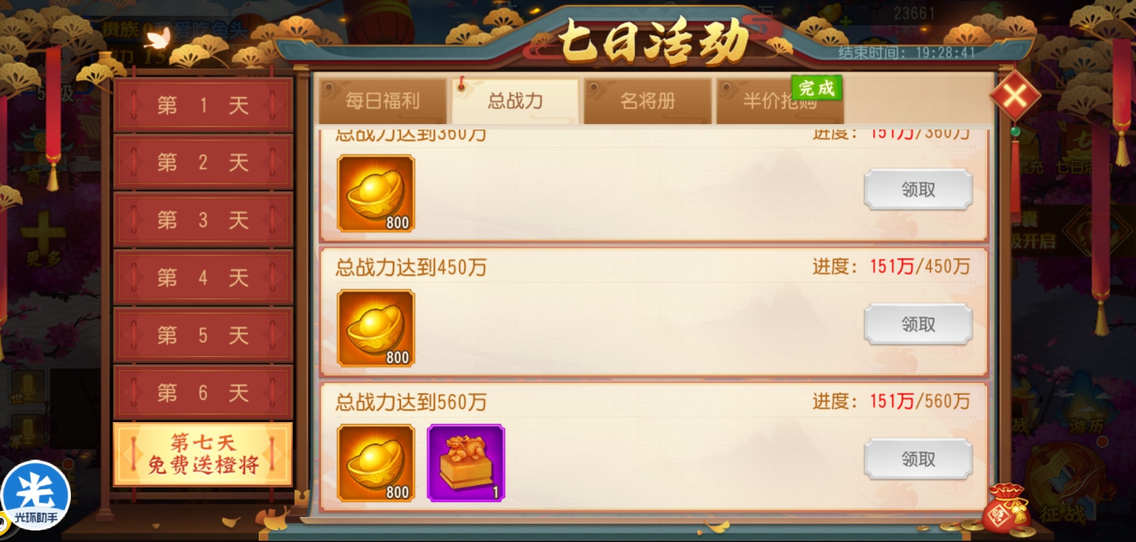 第七天正常完成日常活动,参与军团建设,打造自己阵容,注意收集武将资源,55级后就可以突破6。