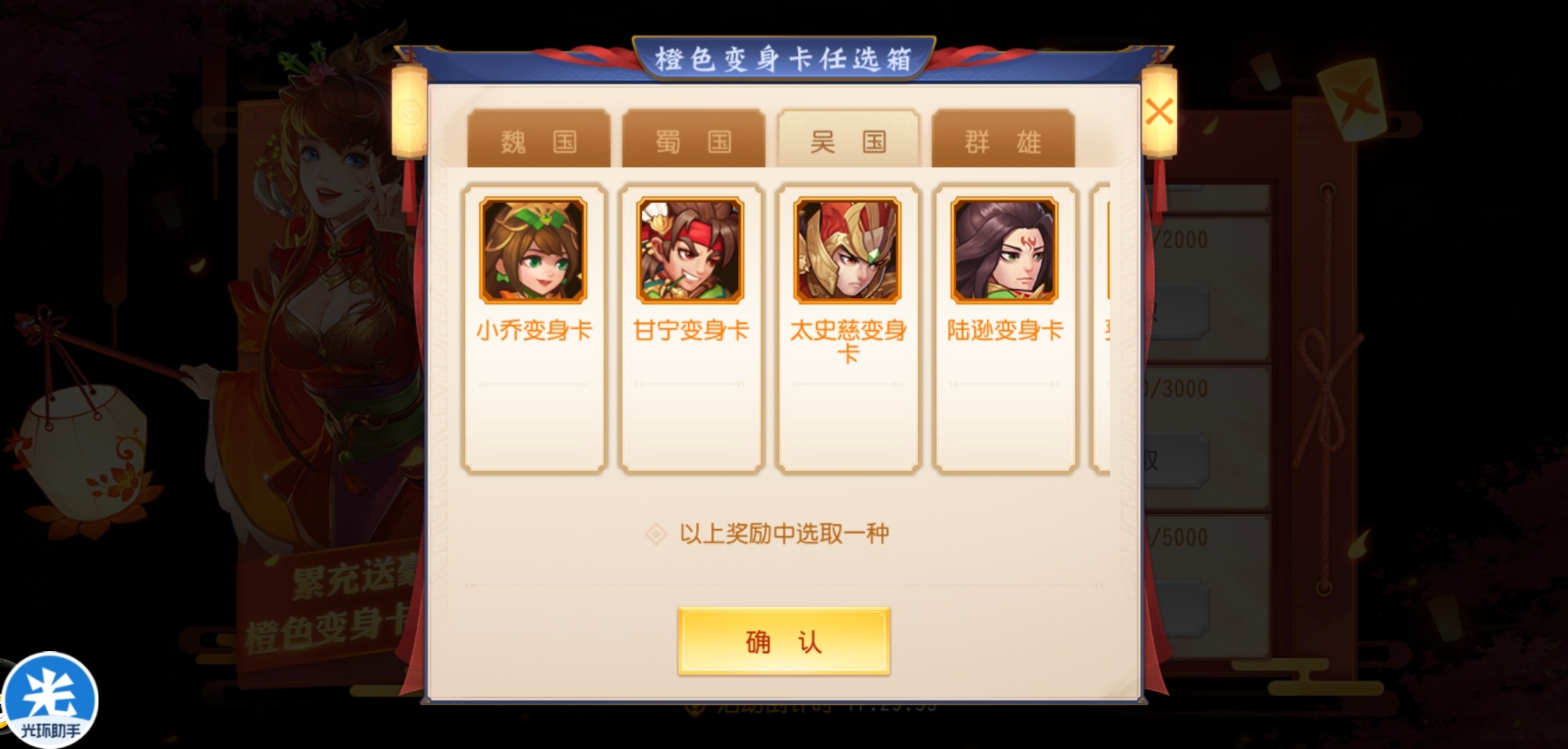 累计充值达到5000可以兑换一个橙色变身卡,前期的话建议都选择小乔就可以,橙色小乔在前期的优势还是非常实用的,95级以后再更换红色变身卡使用。
