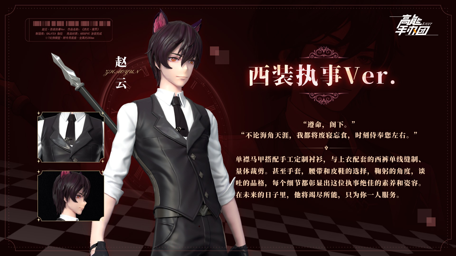 【新皮肤预告】赵云·西装执事Ver.G弟弟发布于 2021-03-04关注赵云·西装执事Ver.即将上架皮肤商店商品名称:赵云·西装执事Ver.作品名称:《赤炎·境界》制造商:GALATEA 伽拉商品材质:ABS&PVC 涂装完成商品规格:1/7比例模型·附专用底座·全高约280mm「不论海角天涯,我都将废寝忘食,时刻侍奉您左右」