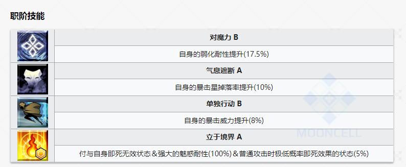 (职阶技能本就有对魔力B17.5%的弱化耐性,配合二技能后是117.5%弱化耐性提升,几乎是FGO大部分弱化都可以miss了)