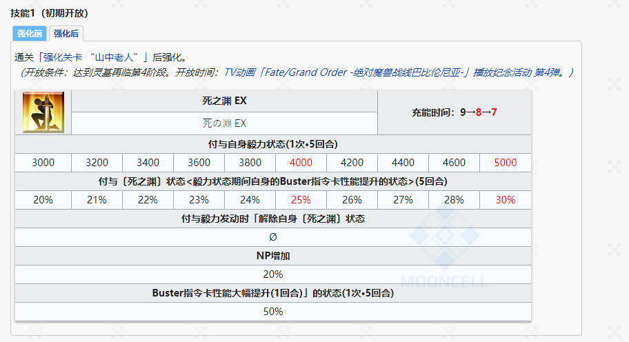 王哈一技能强化后赋予自身站续期间有30%红魔放增伤,触发站续时20NP自充+5回合1次的50%红魔放。