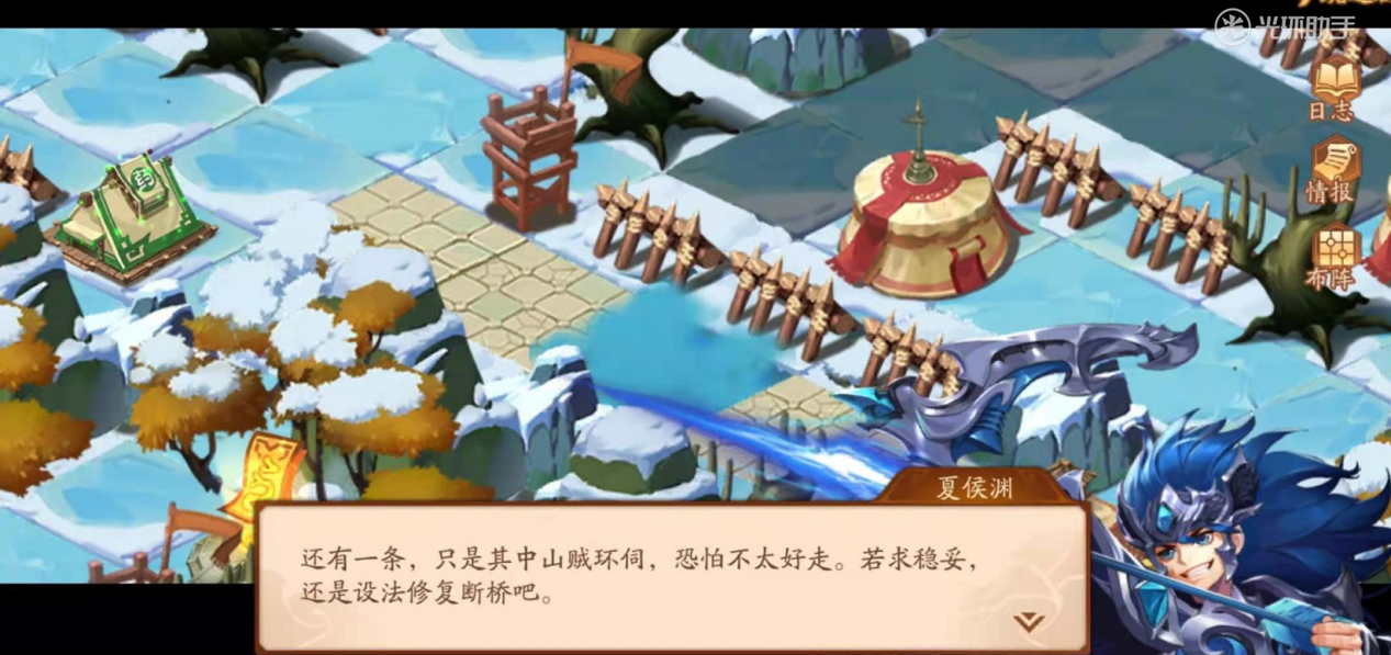 认真对待剧情,可以得到消息,首先山贼不好对付,证明大型帐篷处的山贼战力比较高,战力不足的玩家不要轻易尝试,第二得知吊桥断裂,需要触发如下图的机关,可以继续前行。那么咱们准备绕开山贼,寻找机关。