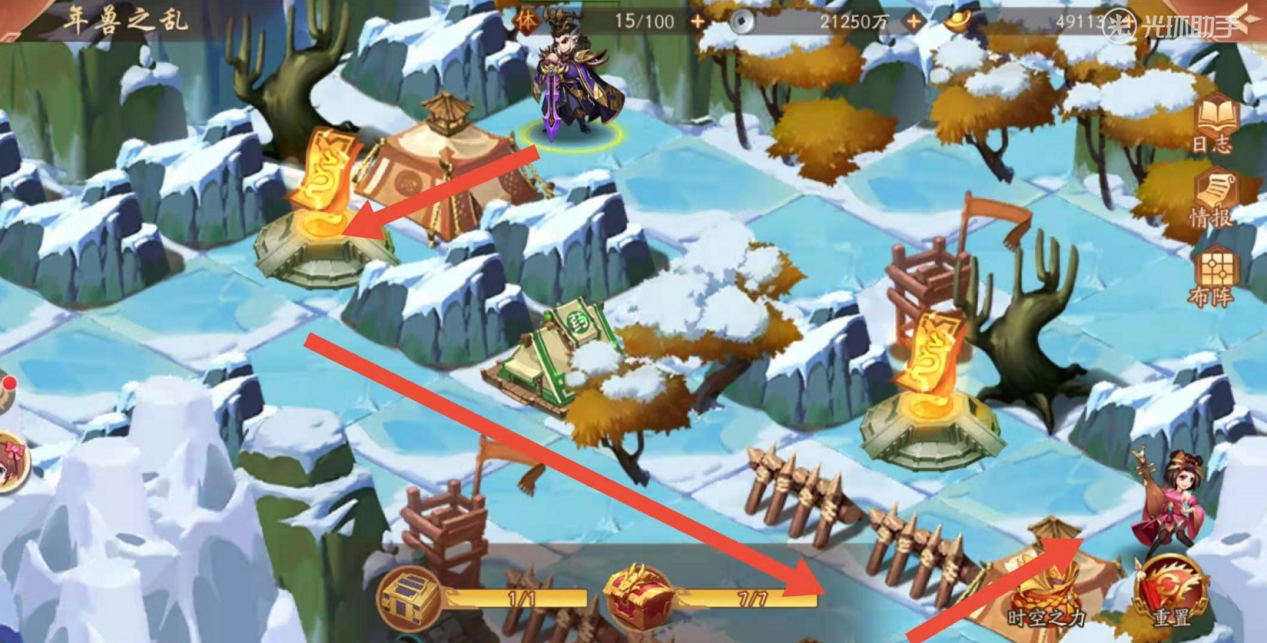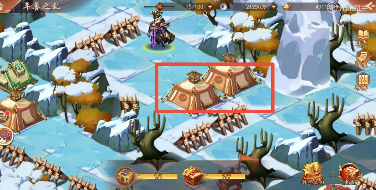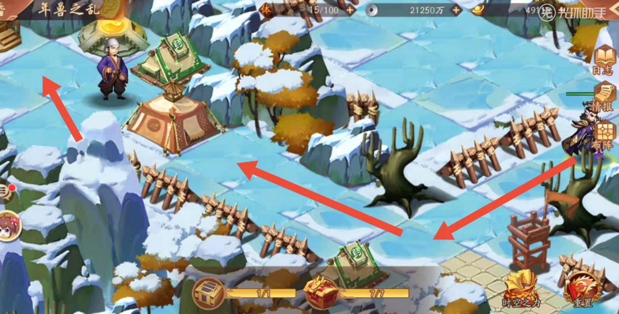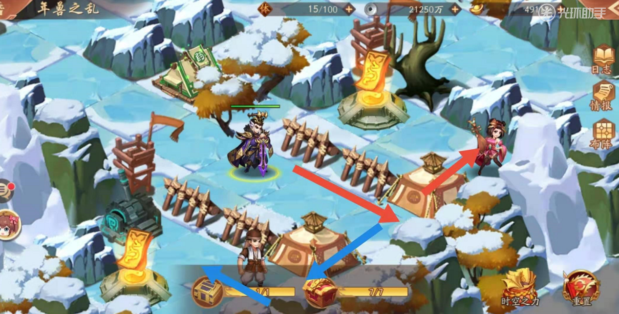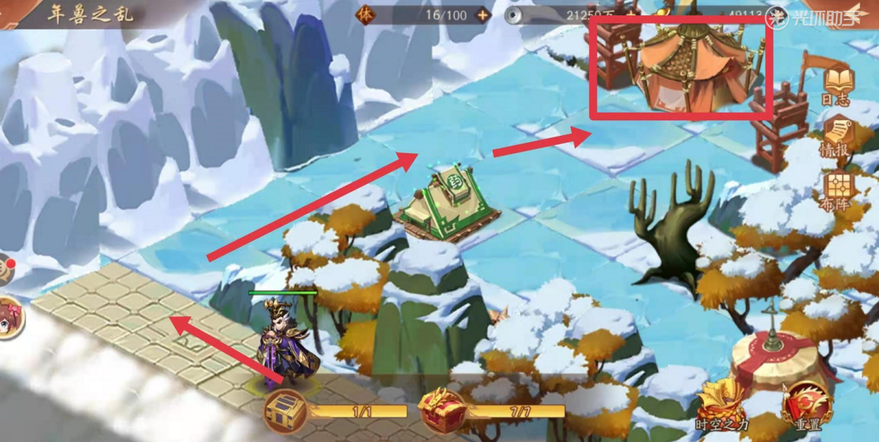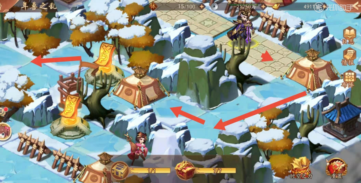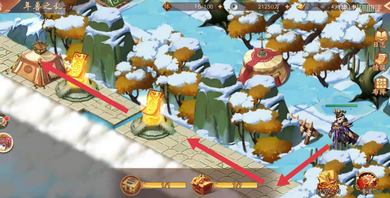 紧接着如下图你会见到拿到宝物之前,最后一处敌军,相对比其他敌军来说,战力比较高,建议在次数补足状态,做好补给后,继续攻打前行。破除如下图画圈处最后一处敌军之后,可以顺利拿到宝物,通关年兽之乱的时空副本。