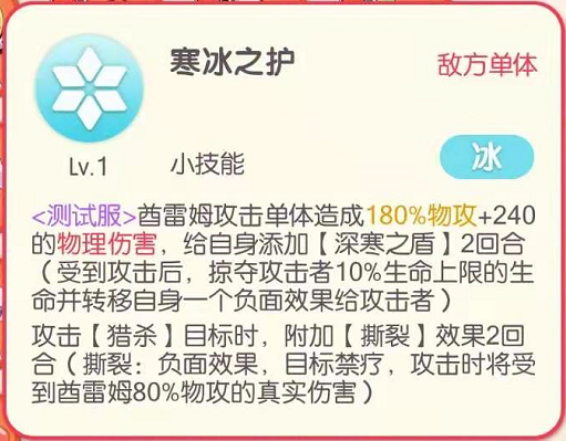 5.被动效果己方前排或自身阵亡时,产生—根冰柱(每个酋雷姆限两次),被击碎时冰冻敌方随机—个精灵2回合。