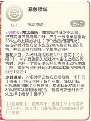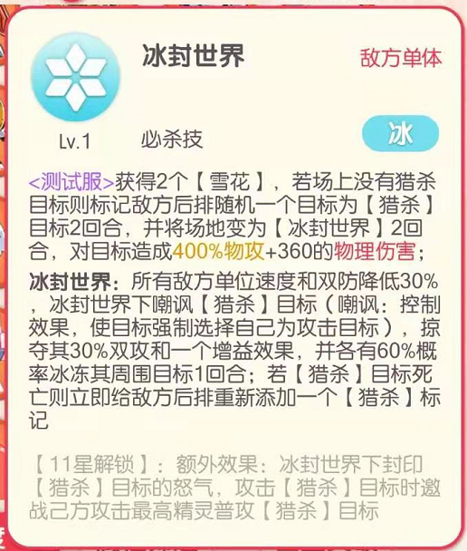 1.入场时控制敌方后排随机1个精灵60%速度和60%回怒速度,2.猎杀标记结束时(2回合后)有80%概率冰冻目标1回合