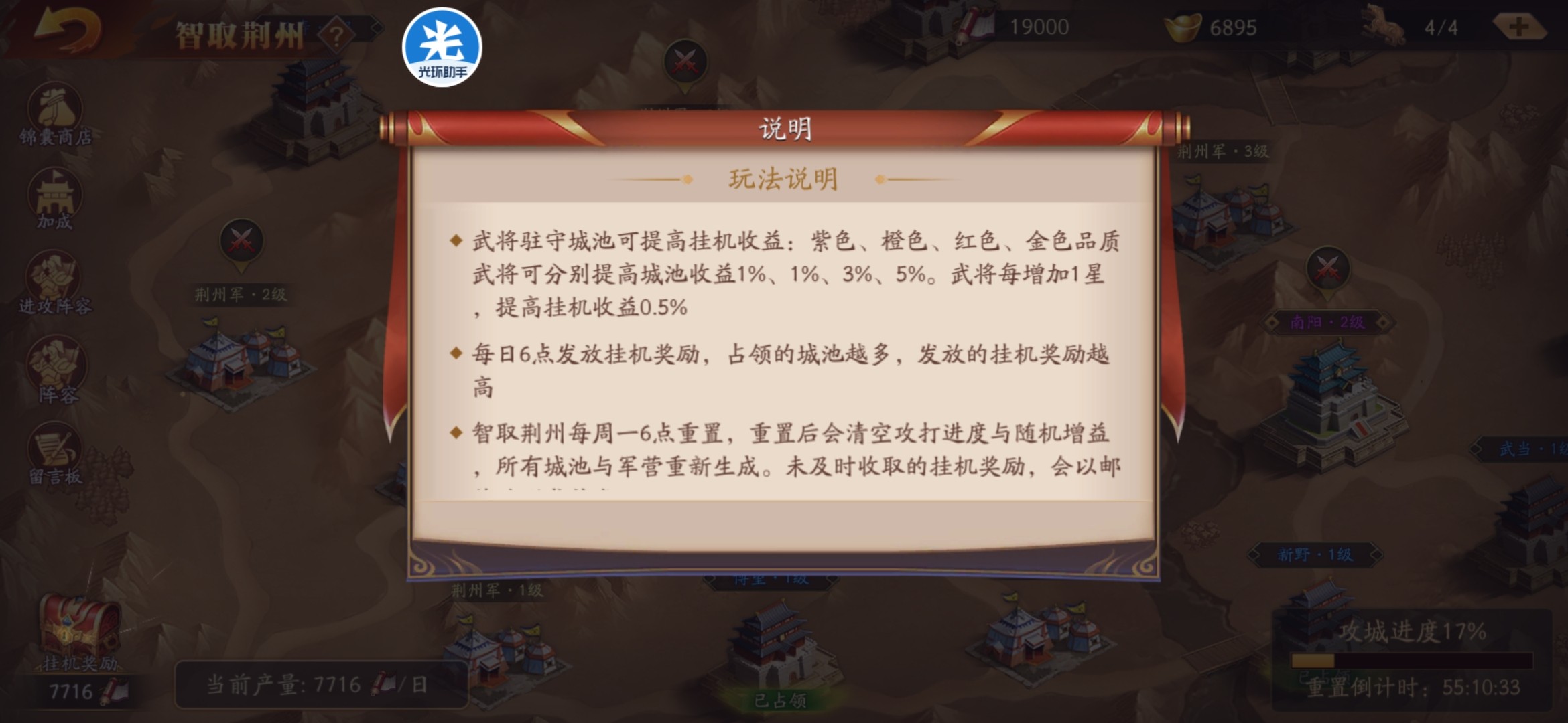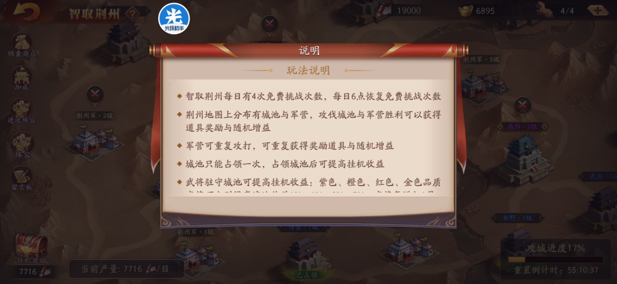 每日4次免费挑战机会,可以选择不同线路,也可攻打多条线路,攻占的城池会产出奖励,驻守武将可以增产
