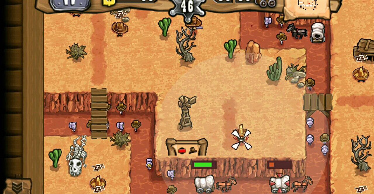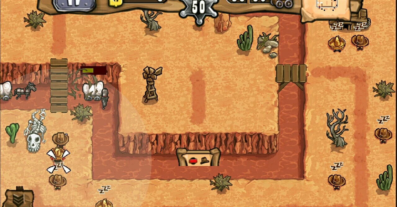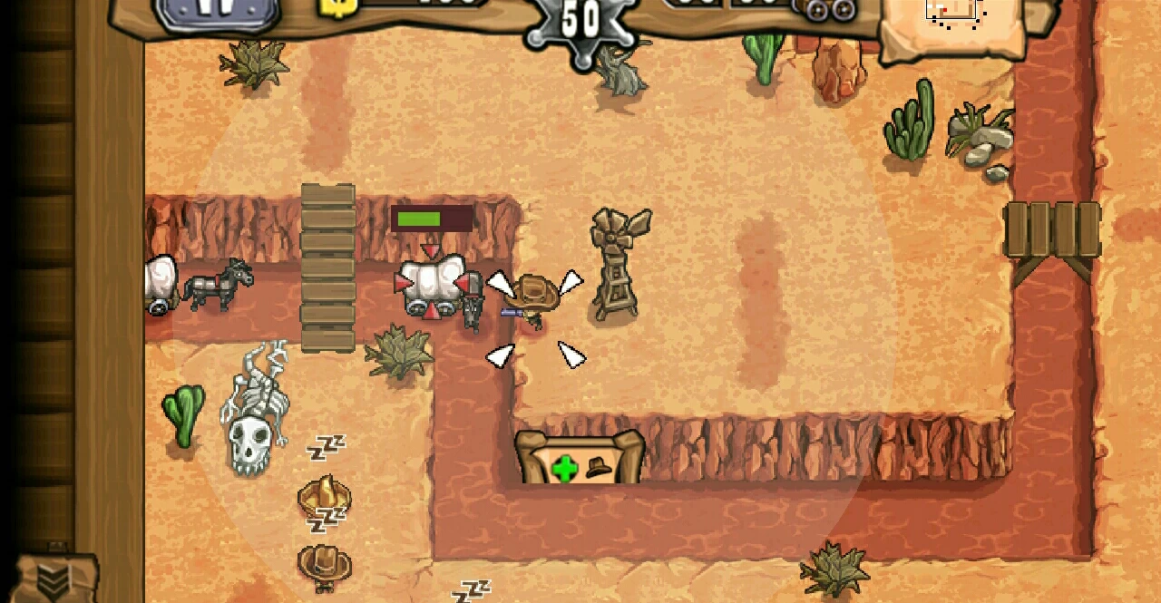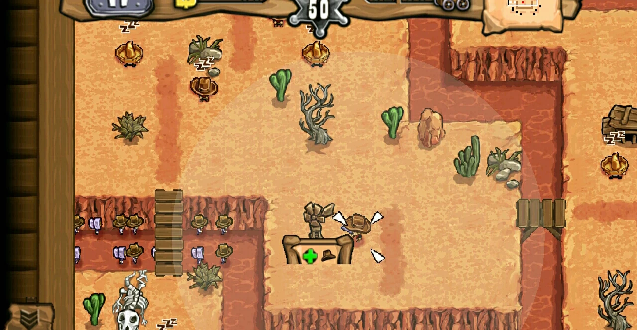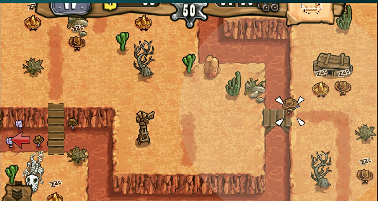 游戏的操作十分简单。玩家将在系统设计好的地图上游戏,只要按动带着大西部牛仔帽的主角上下左右移动即可控制方向。游戏场景主要由两个部分组成:一部分是地面,地面是玩家可以自由移动的区域,上面栽种着仙人掌、停留着破碎的石块,还有无数带着主角同款帽子的牛仔们。另一部分则是通道区域,在土地中穿插着下陷的通道,这里是敌人们的活动区,玩家将在地面上对这些可恨的敌人发起攻击。敌人从通道的一端走出,玩家只需要点击敌人,主角就会自动对他们进行射击。对于单个行动的敌人而言,玩家一枪就能送他们去见上帝,因此,往往在通道前端就可以把他们全部解决。但是,敌人也不会傻傻的只派出一种兵力,除了最基础的单兵,还有防御力更高的马车兵。