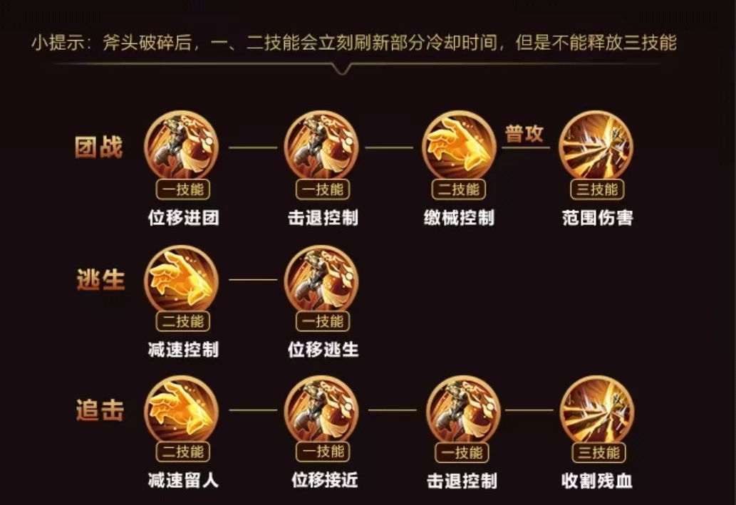小提示:斧头破裂期间,一 二技能会刷新部分冷却时间,但是三技能不能使用。
