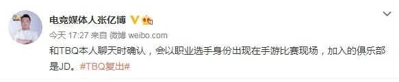 近日,前LGD打野选手TBQ在微博更新推文表示感谢粉丝们的支持,称这次不会让粉丝们失望。自己将以另外一种方式回归。