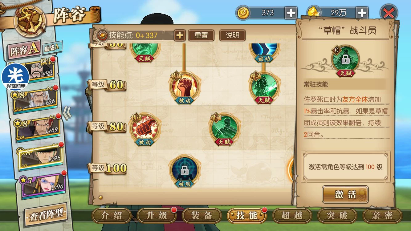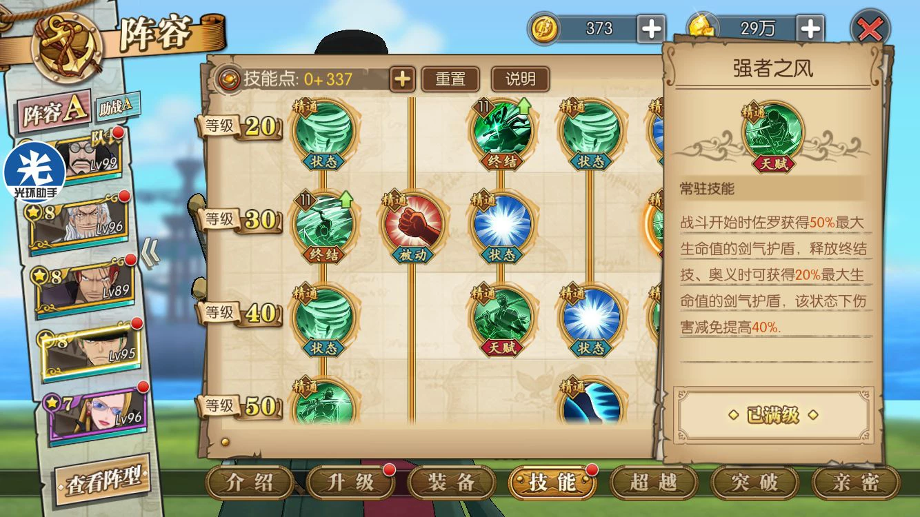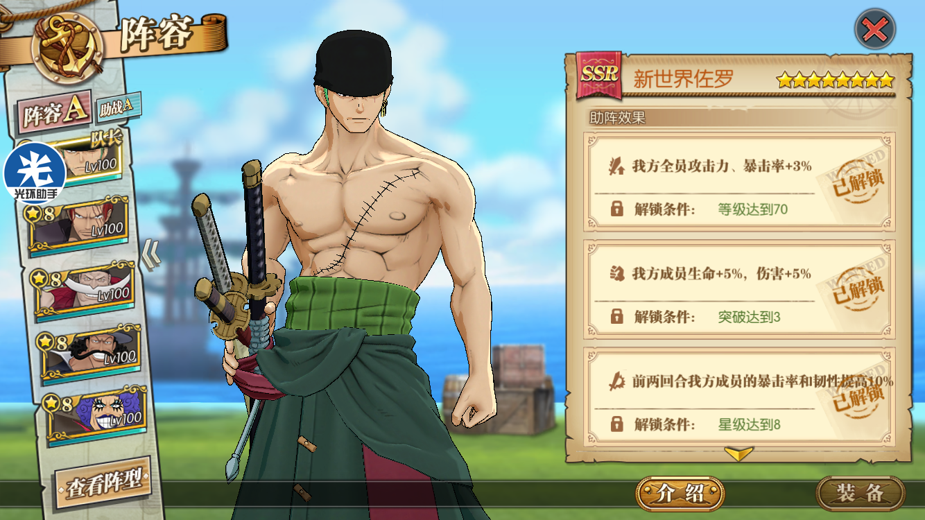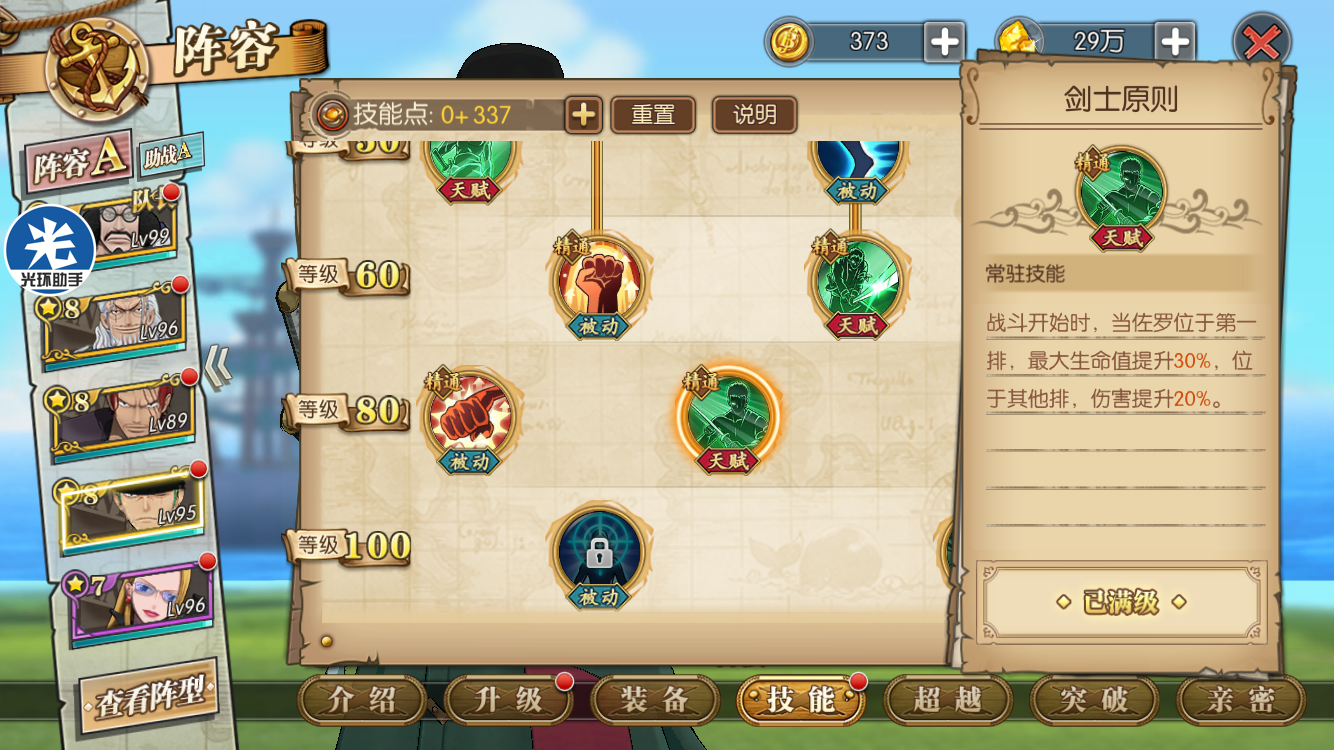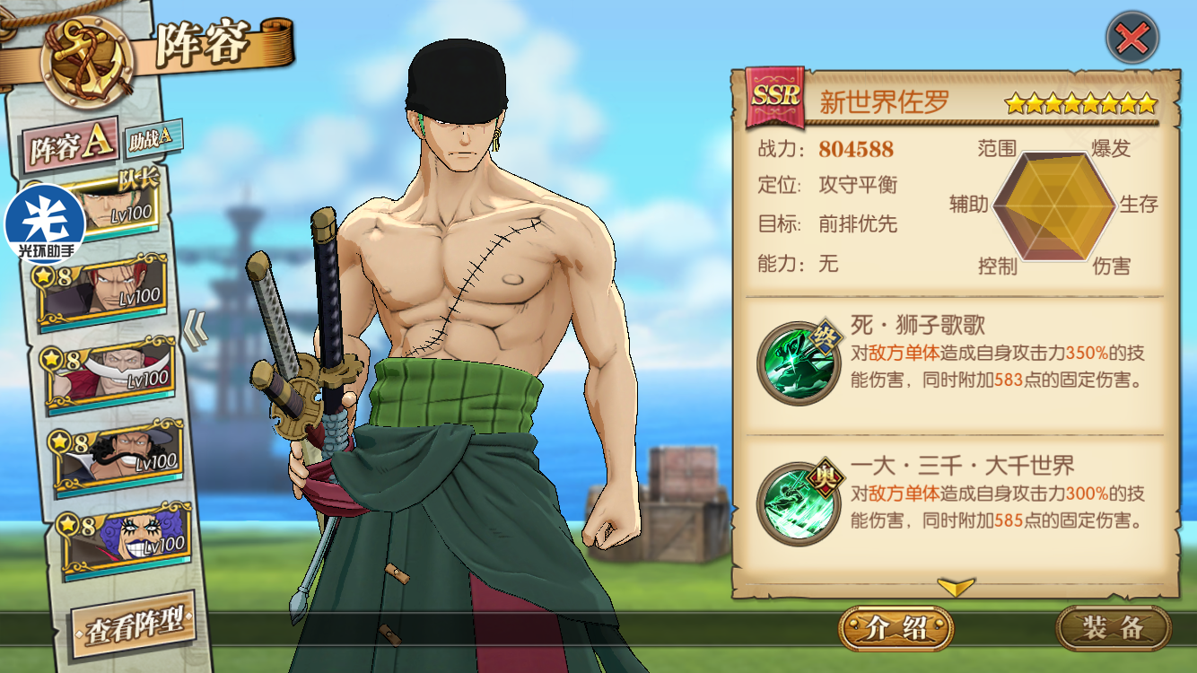 从索隆的面板上可以看到,索隆是一个有肉有高爆发的人,打的是前排优先。技能推荐都是有狮子歌歌与奥义,所以对我们的人物加点给出很大的提示。人物突破与助阵: