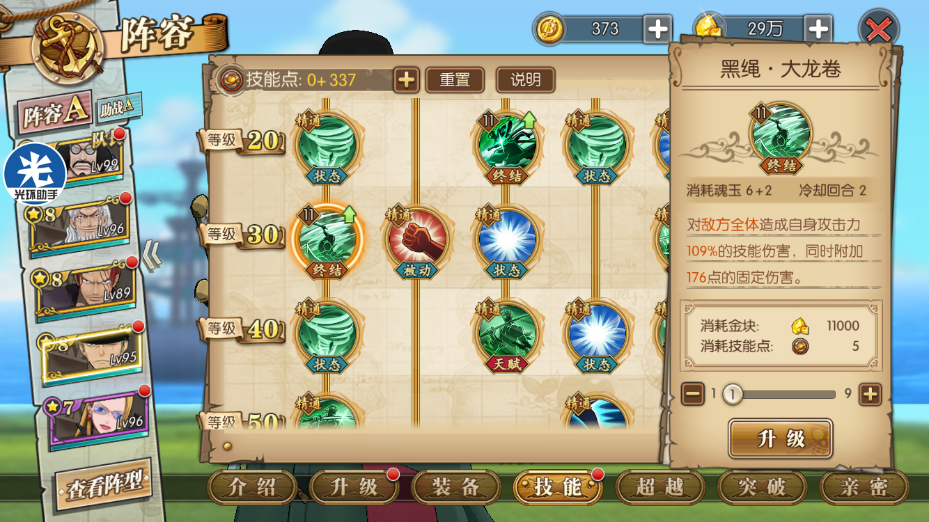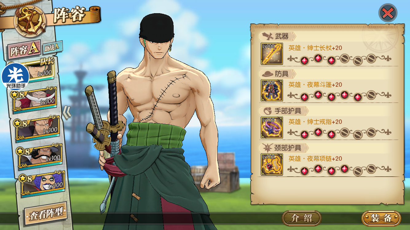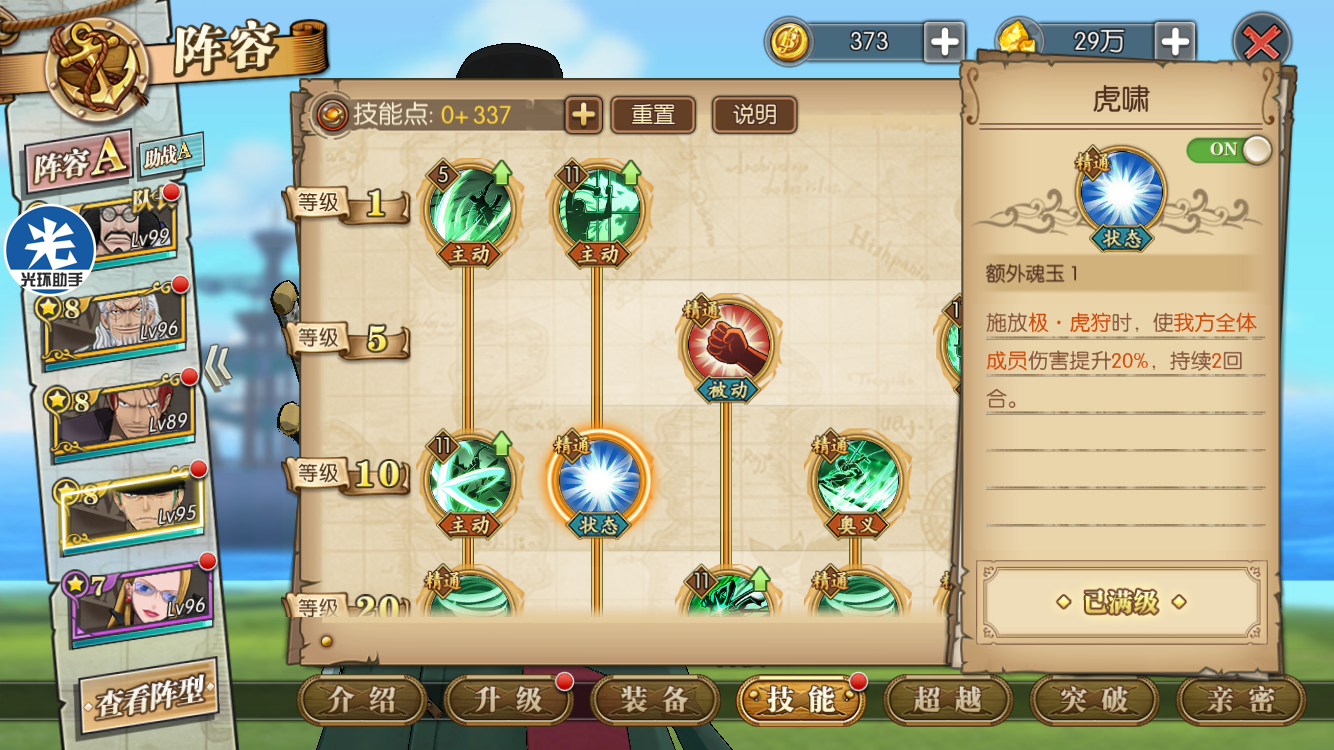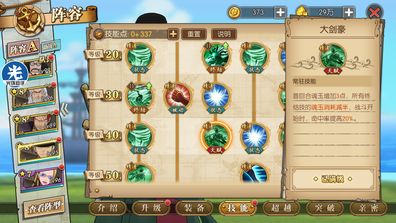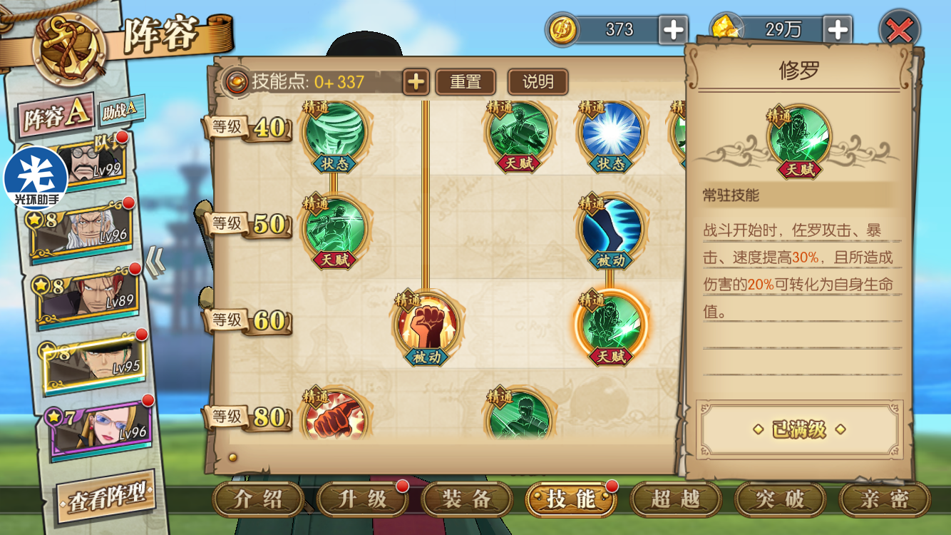 从索隆的面板上可以看到,索隆是一个有肉有高爆发的人,打的是前排优先。技能推荐都是有狮子歌歌与奥义,所以对我们的人物加点给出很大的提示。人物突破与助阵: