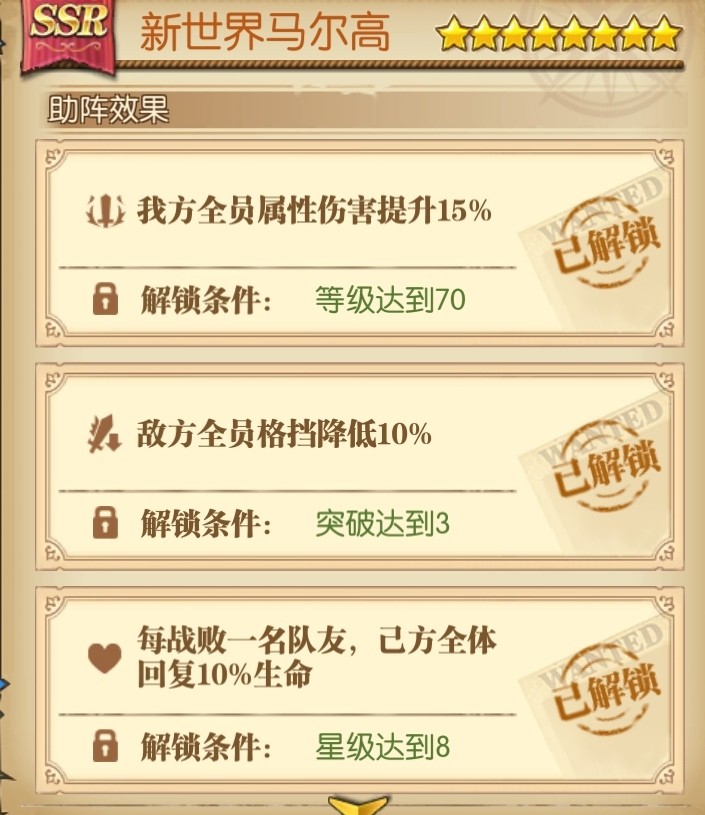 拥有极强的回复能力以及不错的生存能力,是目前唯一一个能复活队友的SSR角色,同时拥有超强的群体回复能力。对于平民来说是必不可缺的一个角色,不管是天梯还是剧情都是非常好用的存在,六星起步,80级上场,100级8星完整。