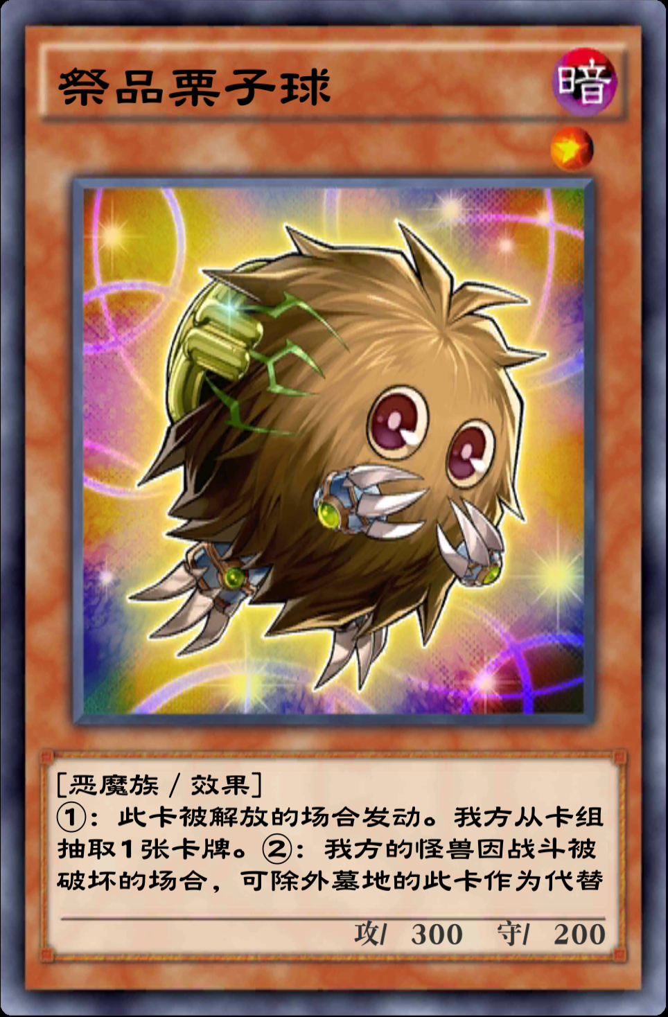 国服又增加了一张栗子球,这张栗子球可以说是挺不错的,可以抵挡一次战斗破坏②效果,同时它的①效果也可以帮助我们从卡组抽一张卡牌,不过这个效果想要打出来,必须要让它当做一个解放怪兽才行