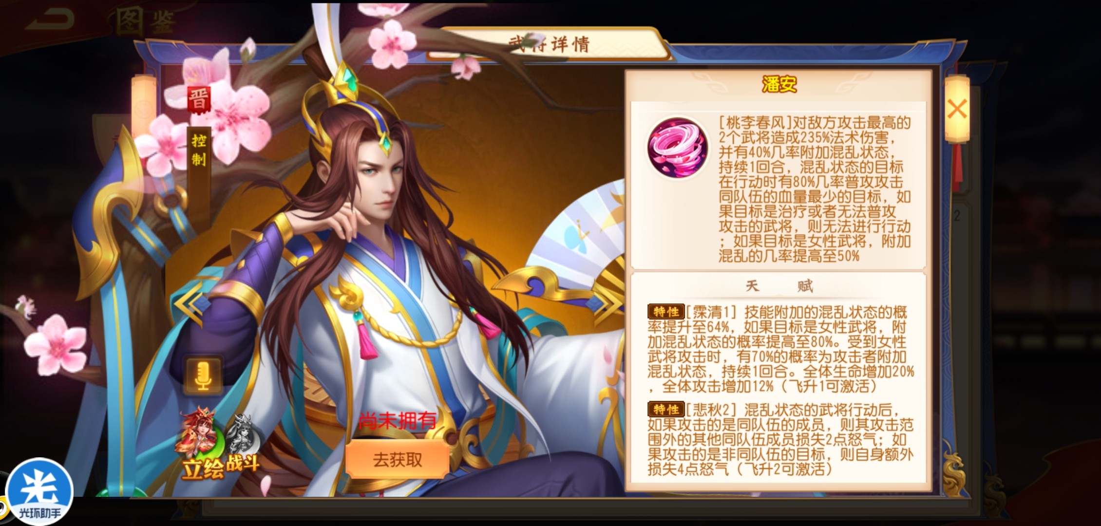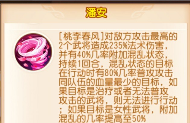 同理,潘安的技能属性是混乱对手攻击力最高的两名武将。