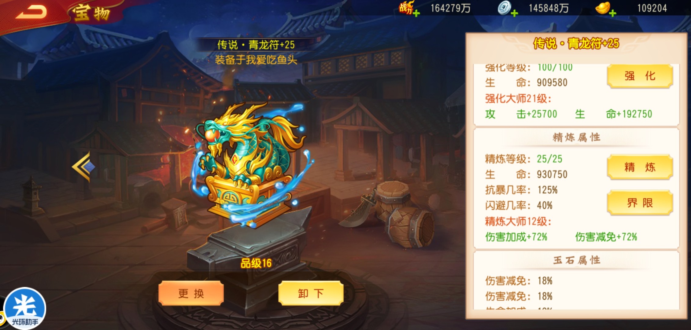 就像下面这个阵容,玩家通过调整左边宝物的强化程度,把武圣关羽和文鸯的攻击数值调整比主角变身的庞统,以及绿珠的攻击还低,就可以保障在第一回合里,关键输出武将武圣关羽和文鸯不会受到潘安的混乱。