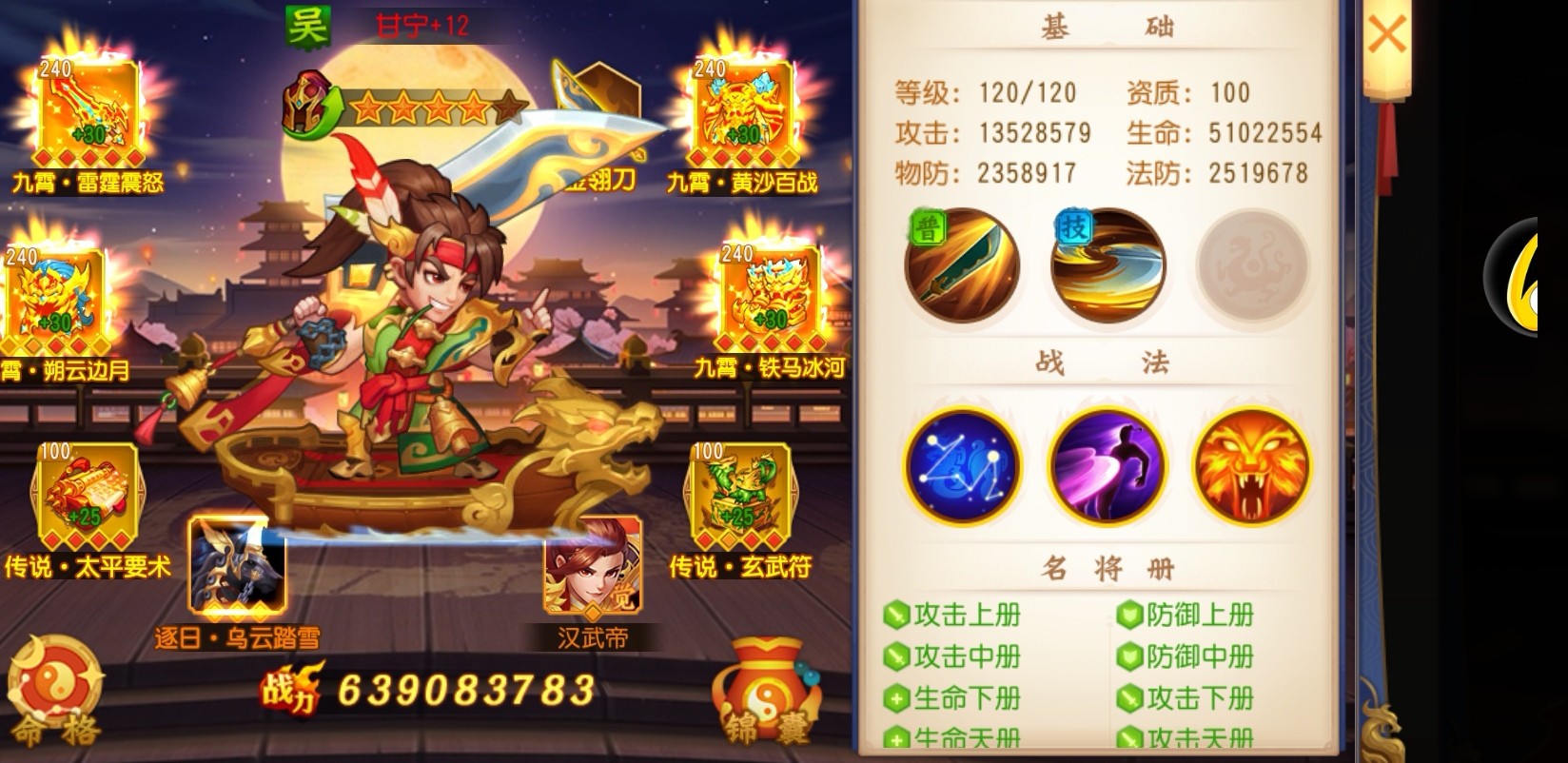 2。甘宁的输出决定战斗力的高低。特别是玉石嗜血+追魂也是重要的资源。