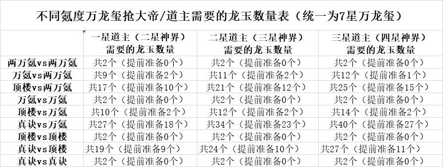 例如万氪和两万氪抢1星道主(400进度)。两万氪的平均进度为13.5,需要30天左右打完400进度(欧皇可能29天就打完),万氪的平均进度为11,需要37天打完。万氪想超车两万氪,需要在28天内就打完,因此需要9个龙玉。在28天内,7星万龙玺可以凝结7个龙玉(高星的更多),所以需要提前存2个龙玉(不放心就3个),这样就可以超车两万氪。