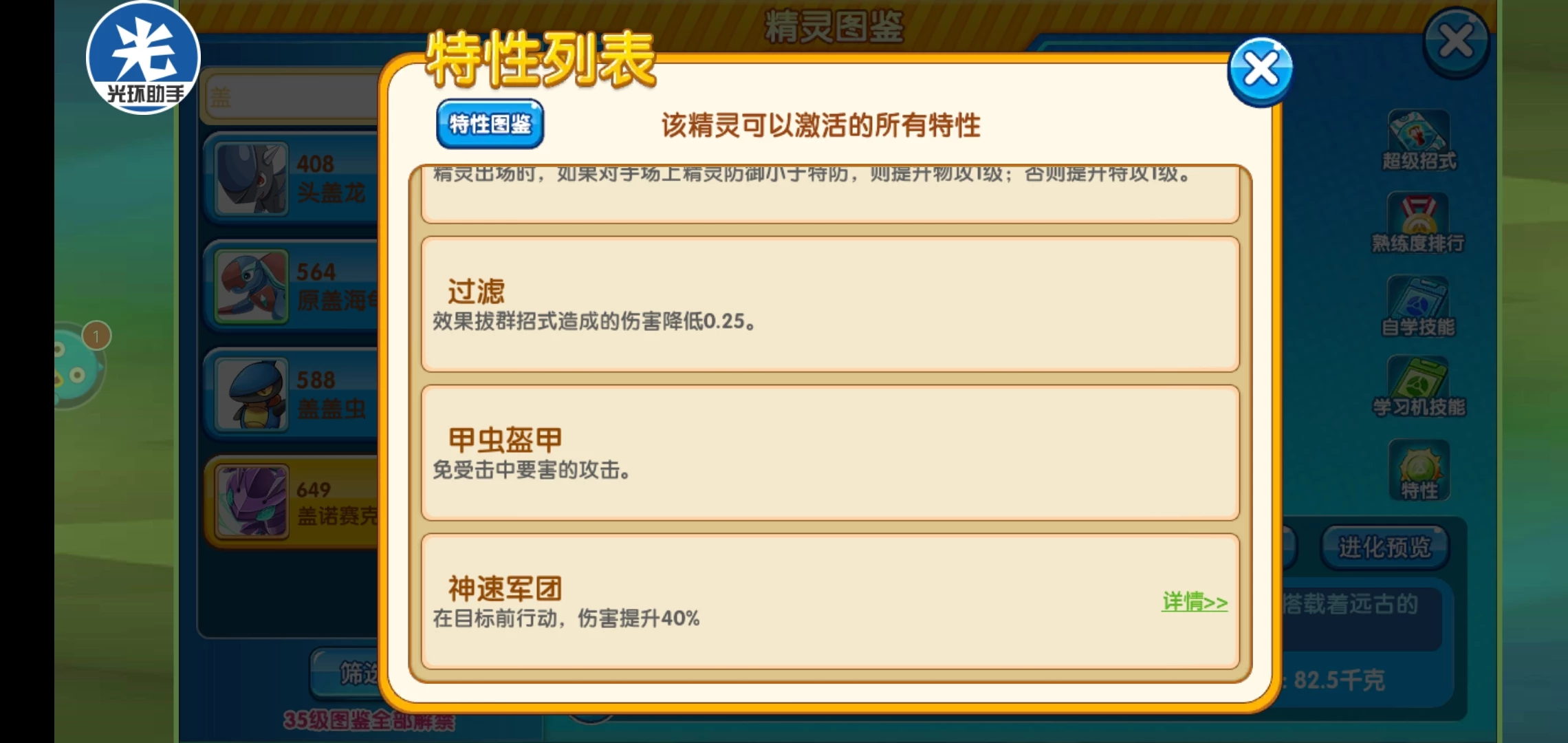 加成项上重要的一项就是特性,神速军团特性的介绍是先手行动伤害提升百分之四十,这就非常恐怖,众所周知,伤害提升和技能威力提升是两码事,最形象的参考就是海皇牙的专属道具海皇之牙和海皇锐牙的差别,前者是技能威力增加百分之三十,后者升级后是伤害增加百分之三十。如果两者用过的玩家肯定知道这两者的差距,因为后者锐牙提升的百分之三十与限定眼镜提升的百分之五十对敌人的伤害都不逞多让,更况且680的神之大专属都增加百分之三十,而虫神特性是百分之四十,所以伤害更加恐怖,也正因为这个特性,让虫神玩家都想法设法的让虫神先手,最直接就是带围巾,不过围巾局限太大,在当然版本不适应,所以顺风队友辅助、大招超级冲浪特效也是个不错的选择。