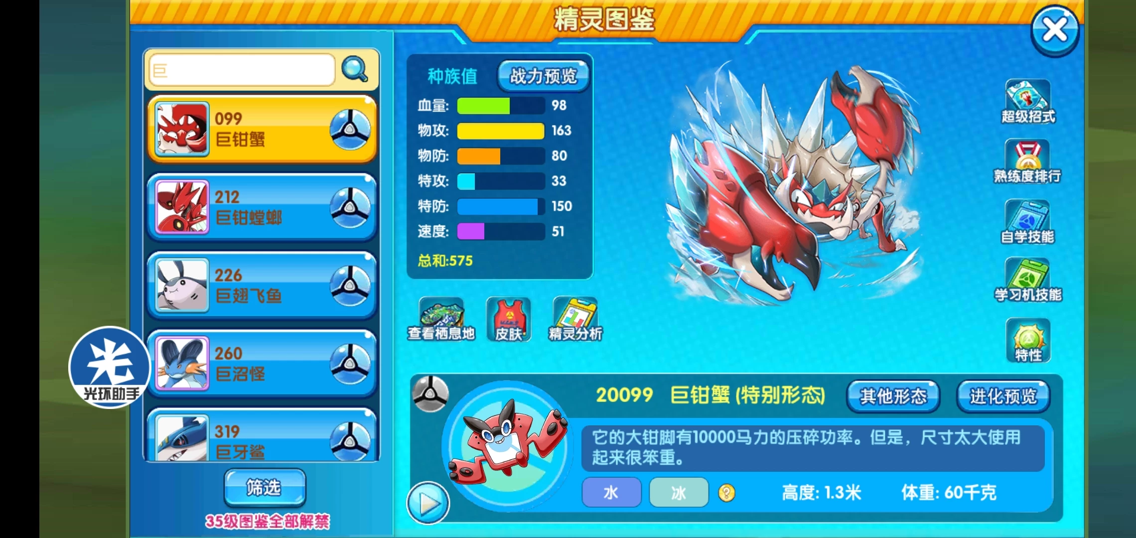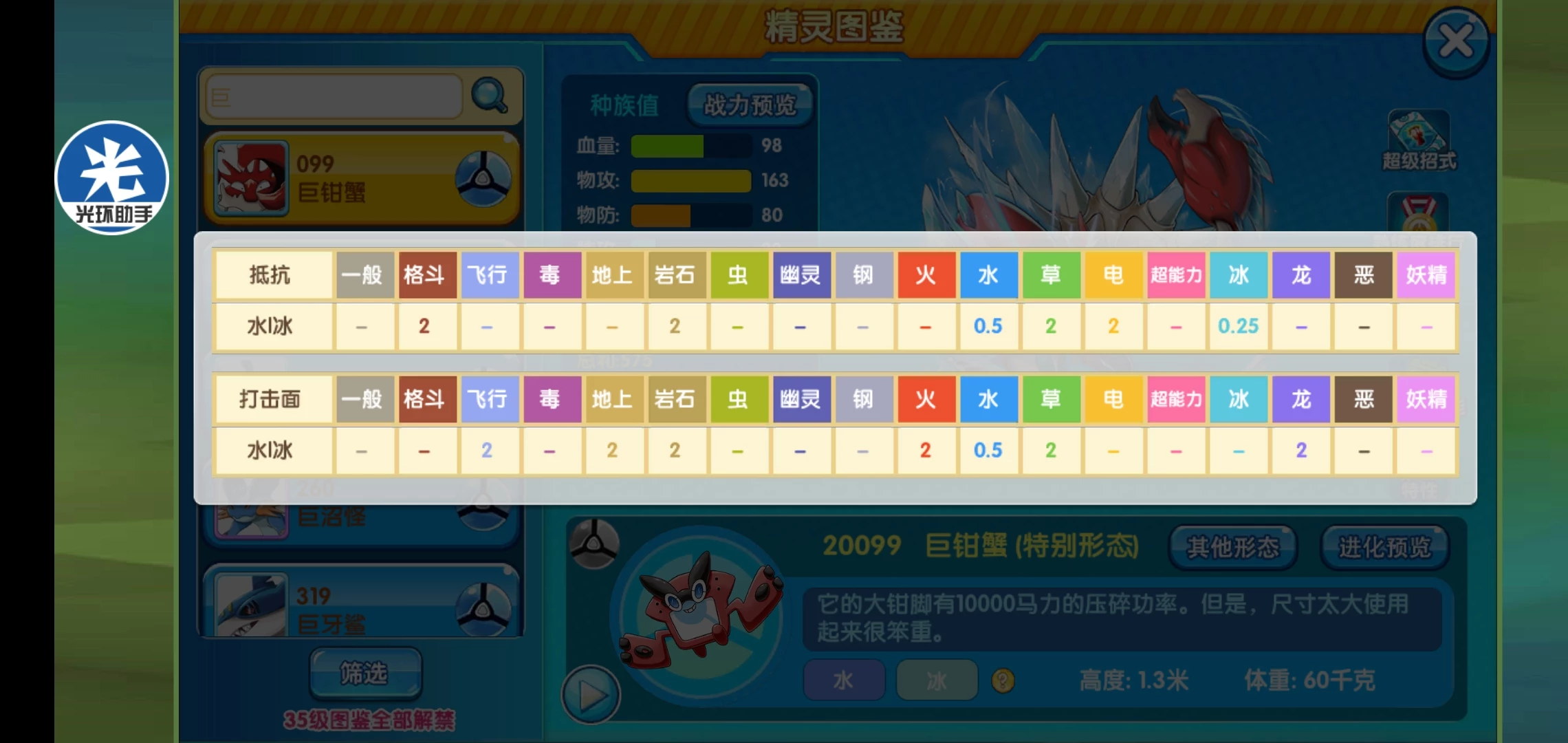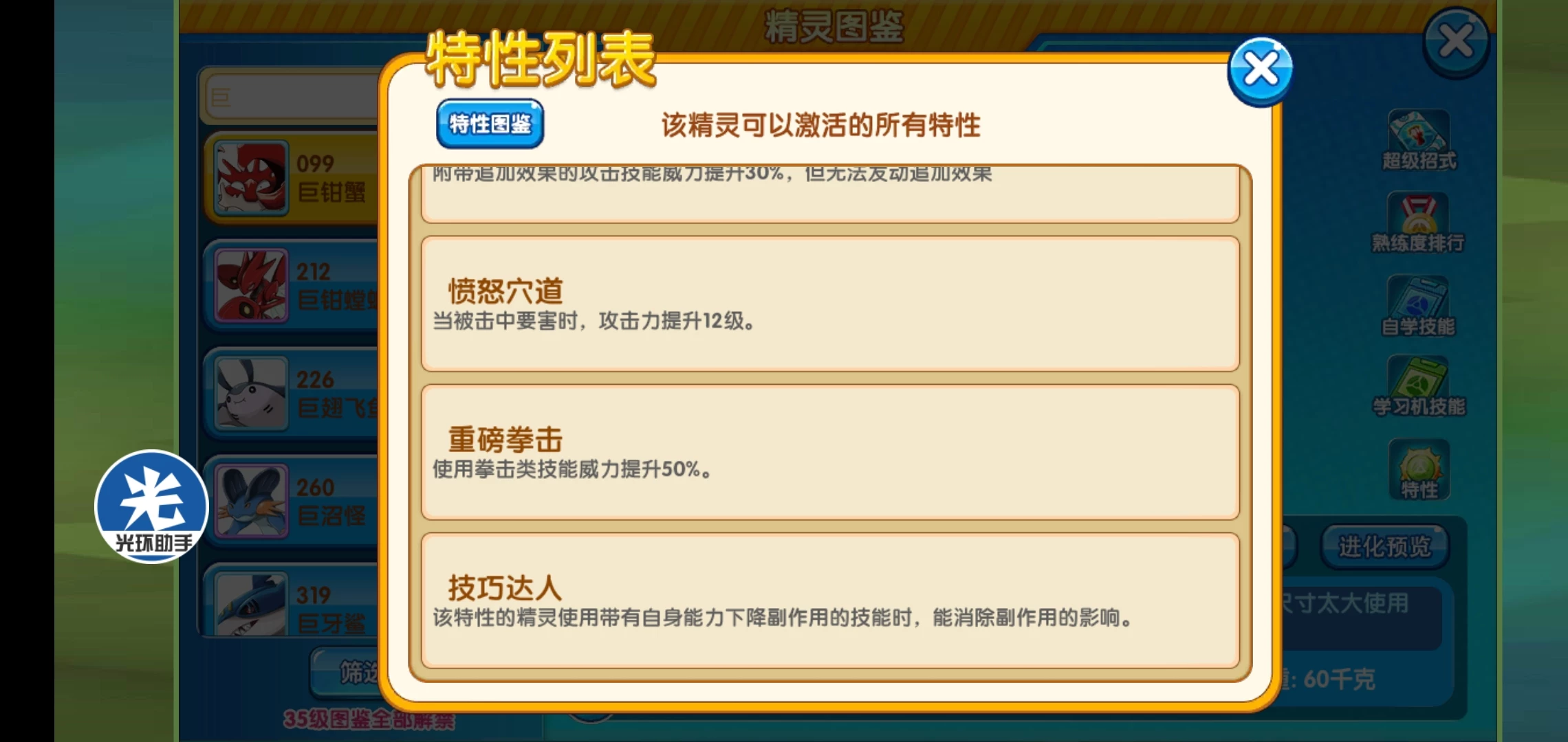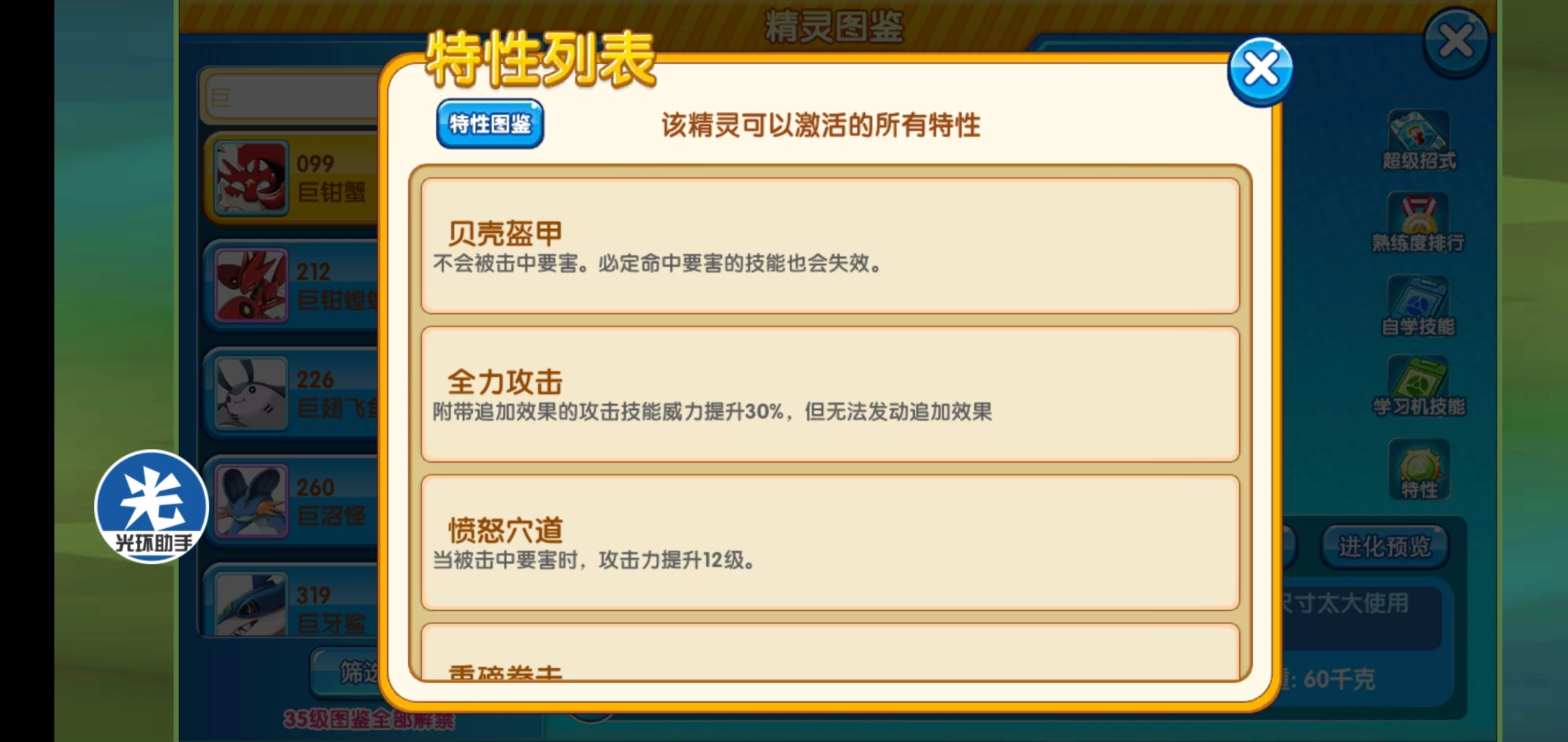 ④重磅拳击:使用拳击类技能威力提升50%,它的拳类就一个本系急冻拳,螃蟹拳原来叫蟹前锤,因为翻译问题,我也给搞混了,不过不知道后面改不改,目前无法触发这个特性。