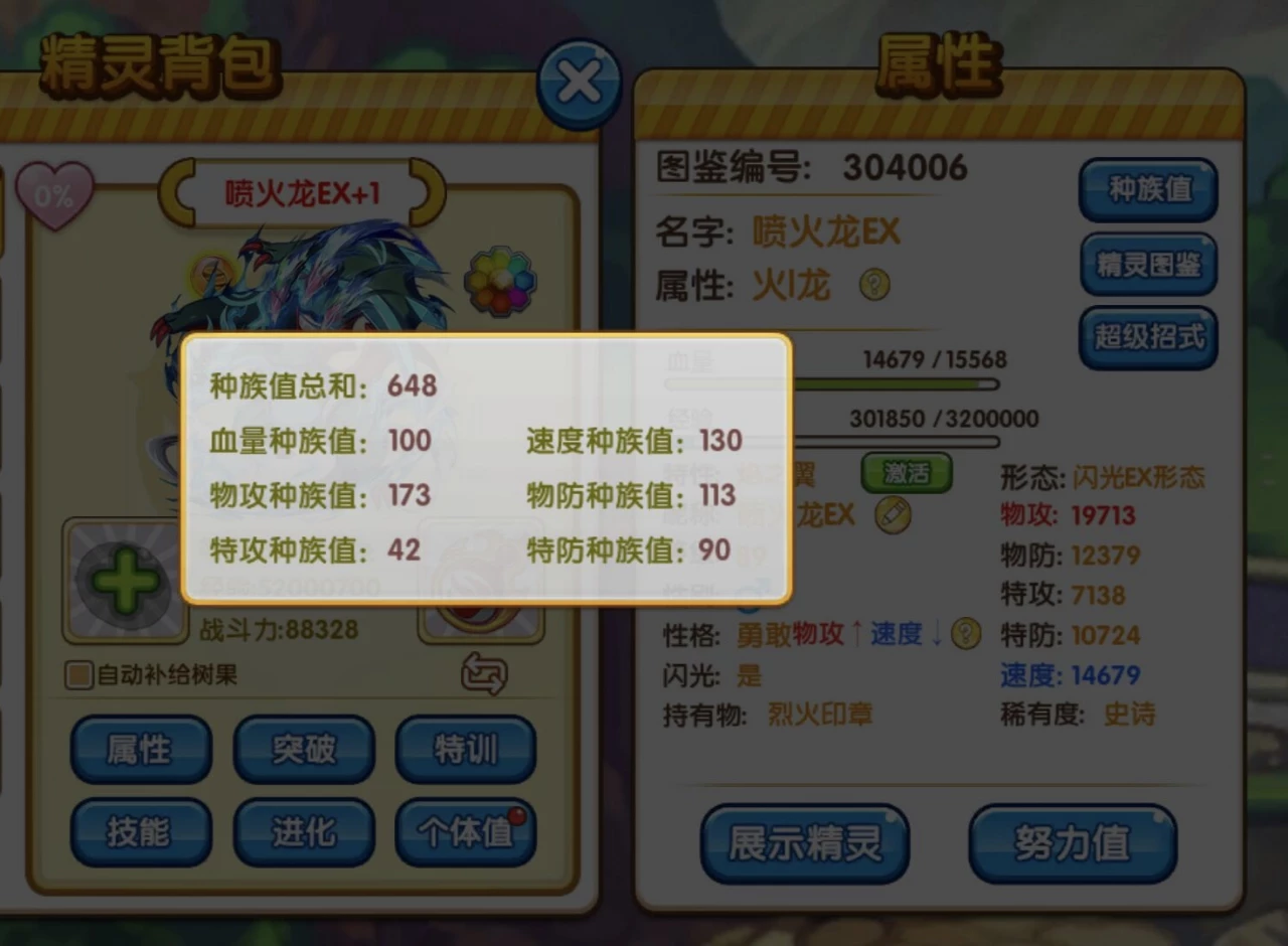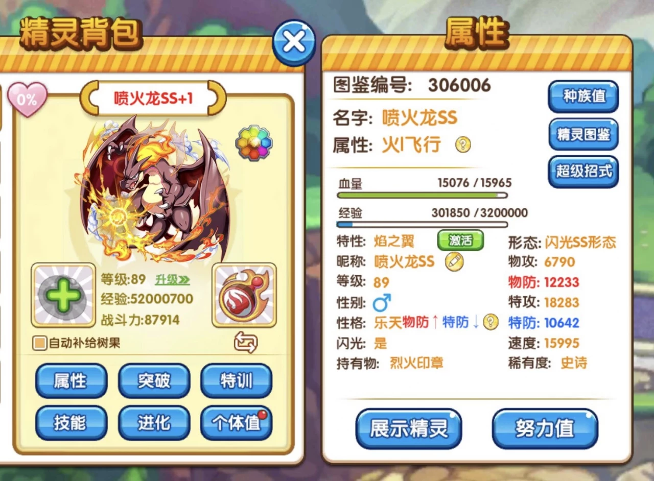 分析:上图还是闪光形态面板,说实话,不是闪光真爱不建议大家玩,毕竟种族差距有点大,这个相当就是在普通Y喷的形态上予以强化,速度特攻还行,但相对于一线来说还差点,它的特性上面在保留原来的旱灾之外,还增加它新的炎之翼,说实话,如果这个特性是像火鸟一样出场自带天气还算有搞头,但是让队友配合开天气就有点划不来,除非你是玩的晴天队,不光它吃天气,队伍里还有其他宠像火猪之类的也蹭了天气,那还可以,但单一的天气队真不怎么样,遇到不克制还行,晴天暴力推别人一队,但是如果对手有克制宠比如海皇牙巨沼怪之类的,那就容易翻车了。